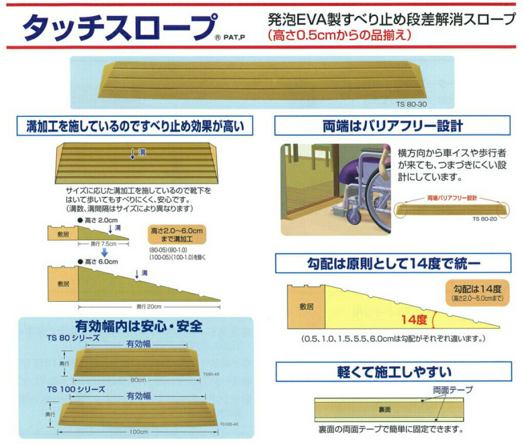 ・軽量で施工しやすい発泡PE製 すべりにくい溝付き段差解消スロープ ・両端バリアフリー設計、横方向から車イスや歩行者が来ても、つまづきにくい設計にしています。 ・サイズに応じた溝加工を施しているので靴下をはいて歩いてもすべりにくく、安心です。 ・スロープ表面は若干のざらつきがありますのでさらに滑りにくくなっています。 ・溝幅0.6cm×深さ0.2cm。半円状の溝ですのでお掃除も楽です。 ・色は日本の家屋にマッチする、落ち着いたブラウンです。 ・裏面の両面テープで簡単に固定できます。(各2本貼付け済み。) ・高さ調整は別売りの調整テープで簡単に施工できます。 ・洋室の出入り口などに ・勾配度数:14 ・両面テープ幅:2.0cm 素材:発泡PE製 サイズ:高さ30mm×幅1000mm×奥行115mm 品番:TS100-30 メーカー:シンエイテクノ(株) 段差解消スロープ タッチスロープ はこちら 68cm幅80cm幅100cm幅 高さ0.5cm 高さ0.5cm 高さ0.5cm 高さ1.0cm 高さ1.0cm 高さ1.0cm 高さ1.5cm 高さ1.5cm 高さ1.5cm 高さ2.0cm 高さ2.0cm 高さ2.0cm 高さ2.5cm 高さ2.5cm 高さ2.5cm 高さ3.0cm 高さ3.0cm 高さ3.0cm 高さ3.5cm 高さ3.5cm 高さ3.5cm 高さ4.0cm 高さ4.0cm 高さ4.0cm 高さ4.5cm 高さ4.5cm 高さ4.5cm 高さ5.0cm 高さ5.0cm 高さ5.0cm 高さ5.5cm 高さ5.5cm 高さ5.5cm 高さ6.0cm 高さ6.0cm 高さ6.0cm