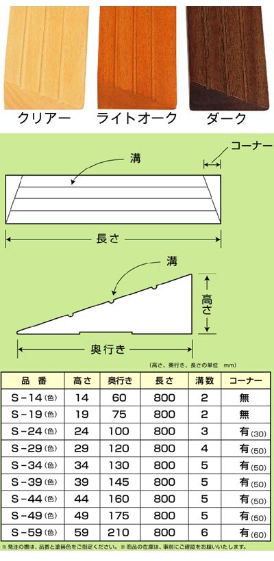 ●サイズ/長さ80×奥行10×高さ2.4cm●溝数/3●コーナー/3cm●材質/天然木●生産国/日本・滑りにくい塗装。カラーも3色から選べます。・住宅内の転倒予防・車いす対応に段差を解消します。住まいのちょっとした段差につまづいてしまう方にも適しています。【バリアフリー静岡】
