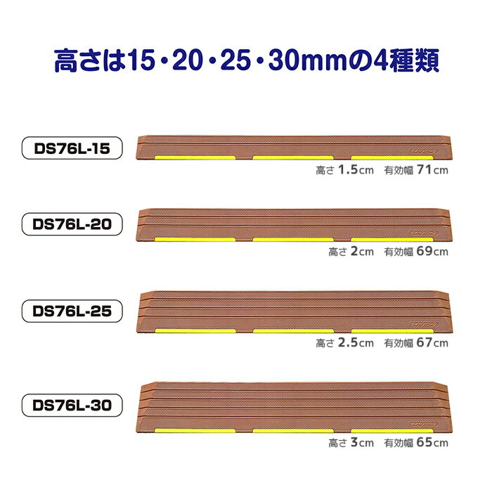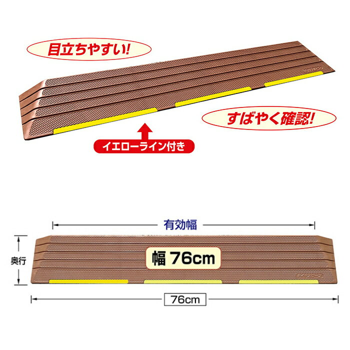 ●ダイヤスロープ室内用(DS76)に新たにイエローラインを つけて分かりやすくしました。 うす暗い場所でも「見えやすく」安心です! ●段差部での転倒防止・つまづき防止・車いすの走行などに。 ●部屋の段差をなくす、減らす。 ●ゴム製スロープはクッション性に富んでいて、 車イスの走行時などでも車輪の振動を吸収し、 身体にショックが伝わりにくい性質です。 ●色は日本の家屋になじみやすいブラウンです。 ●廊下や床に置くだけ、ゴムのすべり止め効果で簡単に 移動しません。 ●スロープ表面が汚れた場合は中性洗剤を使用し洗い 流してください。 ●規格 材質:ゴム 色:ブラウン サイズ:高さ2.5×奥行9.5×有効幅67cm 勾配(度数):14 溝(本数):3 耐荷重:200kg ●ダイヤスロープライン シリーズ一覧 品番をクリックすると各商品へ移動します。 品番 高さ(cm) 奥行(cm) 有効幅(cm) 勾配(度数) 溝(本数) 重量(g) DS76L-15 1.5 5.5 71 14 1 420 DS76L-20 2.0 7.5 69 14 2 670 DS76L-25現在のぺージ 2.5 9.5 67 14 3 950 DS76L-30 3.0 11.5 65 14 4 1300■置くだけで使えるミニスロープ、ゴムのすべり止め効果で簡単に移動しません