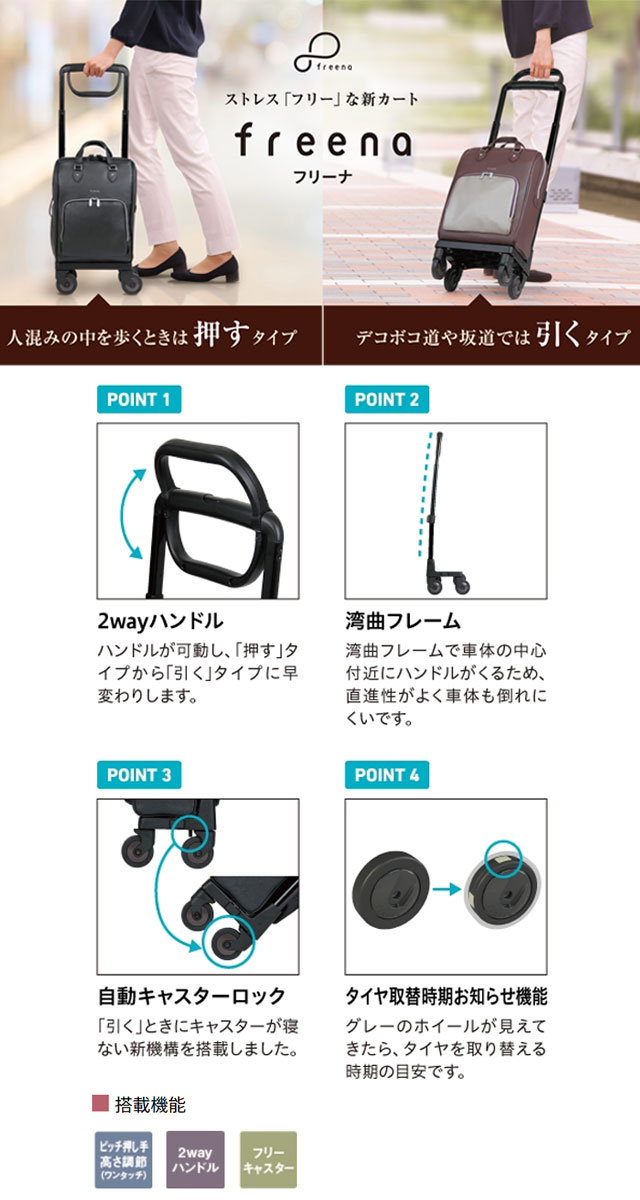 説明 外出時における路面環境はさまざま…施設内は整備されたフローリングですが、一歩外に出れば坂道や段差、砂利道など「カートが思うように動いてくれない」というストレスを感じる人も多いはず。 「こんなカートがあったらいいのに」というお客様の声を集め、『フリーナ』が誕生しました。 ☆瞬間チェンジハンドル 人混みの中を歩くときは『押す』タイプ。 デコボコ道や坂道では『引く』タイプ。 シーンによって、押すタイプから引くタイプに瞬時にハンドルが早変わりします。 ☆湾曲フレーム 湾曲フレームで車体の中心付近にハンドルがくるため、直進性がよく車体も倒れにくい仕様です。 ☆自動キャスターロック 従来のカートは、接地するキャスターが寝てしまい引きにくいことが起こりますが、『フリーナ』はキャスターが垂直に固定されるため、 直進性・操作性が格段に向上し、抜群の引きやすさを実現します。 ☆タイヤ取換時期お知らせ機能 適正な交換時期をお知らせしてくれる“スリップメーター”機能を搭載しているので、安心して長期間お使いいただけます。グレーのホイールが見えてきたら、タイヤを取り替える時期の目安です。 ☆使いやすいポケット付きで、取り外し可能なデザインバッグ! フォーマルからカジュアルまで、どんなシーンでも使いやすく、高級かつシンプルなデザイン。 容量は12リットルなので、普段のお買い物はもちろん、日帰り旅行にも大活躍するバッグです。 内ポケット、背面ポケット、ペットボトル入れ、傘入れなど便利なポケットがたくさんあるのも嬉しいポイント! 玄関先でバッグだけ取り外し、室内へ持っていくことも可能です。 材質 本体:アルミニウム合金 バッグ:ポリエステル 車輪材質:エラストマー サイズ・重量 組み立て寸法: 幅270×奥行180×高さ710〜910mm 押し手高さ: 710〜910mm 5ポジション タイヤ直径:約7.5cm バッグ寸法:幅260x奥行135x高さ350mm バッグ容量:約12L 重量(約):2.3kg 備考 こちらの製品は、高齢者の方の自立歩行をサポートする歩行補助のための手押し車です。 お買い物時は、ショッピングカートとして、お散歩時はウォーキングをさせる杖代わりにお役立ていただけます。 こちらの製品は、リハビリテーション用ではありません。 ・離島、一部地域は別途送料がかかる場合がございます。 ご注文時には、足されておりませんが、後程、別途送料を足した金額を当店よりご連絡致します。 お使いのモニターにより、実際の色と多少の差異がございます。予めご了承くださいませ。 ※メーカー取り寄せのため、お時間がかかる場合がございます。お急ぎの方はお気軽にお問い合わせください。稀に、欠品する場合もございます。その際は、当店よりご連絡させていただきます。 ☆シルバーカー色々取り揃えています ☆その他の島製作所のシルバーカー ☆その他の幸和製作所のシルバーカー ☆その他の須恵廣工業のシルバーカー ☆その他の象印ベビーのシルバーカー≫シルバーカー 一覧はこちら! ▼ シルバーカーのタイプ別で探す!▼ ≫スタンダードタイプ ≫ミドルカータイプ(中型) ≫コンパクトカータイプ(軽量) ≫アルミカー ≫レインカバー付き ≫座れるタイプ ≫前輪3WAY スリーウェイ ≫前輪2WAY ツーウェイ ≫買い物かご受け有り ≫大容量 ≫男性用シルバーカー ≫サイドカー 一覧はこちら! ▼ サイドカーのタイプ別で探す!▼ ≫お買い物用 ≫旅行用 ≫360度回転キャスター ≫2WAYキャスター ≫3WAYキャスター ≫レインカバー付き ≫ステッキ 一覧はこちら! ▼ ステッキのタイプ別で探す!▼ ≫一本杖 ≫四点杖 ≫折りたたみ式杖 ▼ その他のおすすめ商品 ▼ ≫リクライニングチェア ≫手すり ≫歩行器・歩行車 ≫酸素ボンベカー