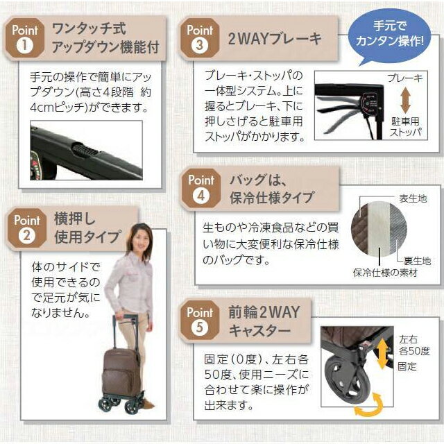 ○サイドで押して、足もと楽々 様々な機能を備えた軽量サイドカー ○4段階の高さ調整 〇ワンタッチ操作の手元ボタンで簡単にハンドル高さの変更可能 ○2WAYブレーキ 〇上に握るとブレーキ 下におろすと駐車ストッパ 手元で簡単操作 ○保冷仕様のバッグ 〇生物や冷凍食品のお買い物にも便利な保冷仕様のバッグ 表生地、保冷仕様の素材、裏生地 ○前輪2WAYキャスター 〇ワンタッチキャスターで進む方向も思いのまま! 左右各50度、固定 ○横押しだから軽い力で楽々操作! ○アルミフレーム、ストッパーで停止中も安心、便利な後ポケット付、便利な傘ホルダー付 商品名 サイドカー メロディ プリモ(ブレーキ付き) 材質・原材料 <材質> ○本体:アルミパイプ(粉体塗装) ○タイヤ:EVA(硬質発泡車輪) ○バッグ・表生地:ポリウレタン ○バッグ・中綿:ポリエステルファイバー ○バッグ・保冷材:発泡ポリエチレン 規格詳細 高さ840mm×幅365mm×奥行240mm 収納時サイズ:H66×W36.5×D24(cm) ○ハンドル高:72~84(cm) ○高さ調整:4段階(4cmピッチ) ○タイヤ直径:前輪 約12cm、後輪 約12cm ○バッグ耐荷重:8kg ○バッグサイズ:H37×W29×D17(cm) サイズ・重量 重量約2.5kg JANコード 【右用】 メッシュBK:4945528231108 キルティングBK:4945528231009 ローズ柄R:4945528231023 【左用】 メッシュBK:4945528231122 キルティングBK:4945528231030 ローズ柄R:4945528231054 メーカー名 株式会社島製作所 お祝い事に結婚祝い 結婚内祝い 結婚お祝い 結婚御祝 祝御結婚 結婚式 引き出物 引出物 御出産御祝 出産御祝 出産祝い 出産内祝い 祝御出産 御新築祝 新築御祝 新築内祝い 祝御新築 誕生日 バースデー バースデイ 快気祝い 快気内祝い 昇進祝い 昇格祝い 就任 合格祝い 進学内祝い 成人式 卒業記念 卒業祝い 御卒業御祝 入学祝い 入学内祝い 就職祝い 社会人 お祝い 御祝い 金婚式御祝 銀婚式御祝 退職祝い 還暦祝い 古希 喜寿 傘寿 半寿 米寿 卒寿 白寿 上寿季節の贈り物に父の日 母の日 敬老の日 御中元 クリスマス 冬ギフト お歳暮 御歳暮 年賀 お正月 年末年始 バレンタイン ホワイトデー日常の贈り物に御祝 御礼 御挨拶 引越し 粗品 お使い物 贈答品 ギフトセット プレゼント お土産 手土産 贈りもの 進物 お見舞い 入院 初任給 親孝行 お返し ご進物