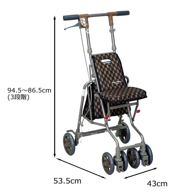 ○前輪キャスター付で方向転換もスムーズ ○座面のみの折りたたみ可能 〇軽くてコンパクト、持ち運びに便利 〇手元でブレーキとストッパの操作ができます ○2WAYブレーキシステム 〇ブレーキレバーを握ればブレーキ、下に押し下げると駐車用ストッパの便利な一体型ハンドブレーキ。 ○折りたたみ可能 コンパクトになりワンタッチで折りたためる楽々タイプ。(折りたたんだ状態で自立します) 高さ調節:3段階(ピッチサイズ 約4cm) バッグ載荷重:2kg バッグサイズ:約H24×W25×D13cm(外寸) 傘受け付 商品名 サニーウォーカーAW-3 材質・原材料 フレーム:アルミ 規格詳細 ○使用時サイズ:約H86.5~94.5×W43×D53.5cm ○収納時サイズ:約H68×W43×D35cm ○座面高:約46cm ○座面サイズ:約W25×D18cm ○タイヤ直径:前輪 約12.5cm、後輪 約14.5cm ○バッグサイズ:約H24×W25×D13cm(外寸) ○最大使用者体重80kg サイズ・重量 重量約4.3kg JANコード CLブラウン:4945528236844 Bブラウン:4945528236660 メーカー名 株式会社 島製作所 お祝い事に結婚祝い 結婚内祝い 結婚お祝い 結婚御祝 祝御結婚 結婚式 引き出物 引出物 御出産御祝 出産御祝 出産祝い 出産内祝い 祝御出産 御新築祝 新築御祝 新築内祝い 祝御新築 誕生日 バースデー バースデイ 快気祝い 快気内祝い 昇進祝い 昇格祝い 就任 合格祝い 進学内祝い 成人式 卒業記念 卒業祝い 御卒業御祝 入学祝い 入学内祝い 就職祝い 社会人 お祝い 御祝い 金婚式御祝 銀婚式御祝 退職祝い 還暦祝い 古希 喜寿 傘寿 半寿 米寿 卒寿 白寿 上寿季節の贈り物に父の日 母の日 敬老の日 御中元 クリスマス 冬ギフト お歳暮 御歳暮 年賀 お正月 年末年始 バレンタイン ホワイトデー日常の贈り物に御祝 御礼 御挨拶 引越し 粗品 お使い物 贈答品 ギフトセット プレゼント お土産 手土産 贈りもの 進物 お見舞い 入院 初任給 親孝行 お返し ご進物