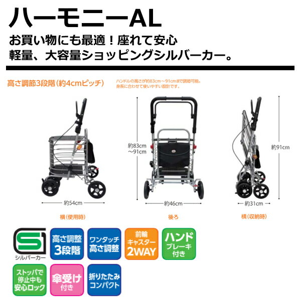 商品名 : 島製作所 ハーモニーAL 軽量 アルミ製 シルバーカー ショッピングカー ショッピングカート 座れる ギフト 母の日 敬老の日 老人車 手押し車 高齢者 買い物 外出 折りたたみ 自立