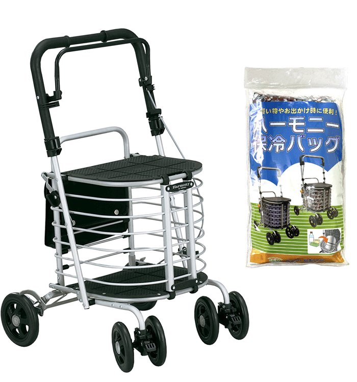 商品名 : 島製作所 ハーモニーAL + 保冷バッグセット軽量 アルミ製 シルバーカー ショッピングカー ショッピングカート 座れる ギフト 母の日 敬老の日 老人車 手押し車 高齢者 買い物 外出 折りたたみ 自立