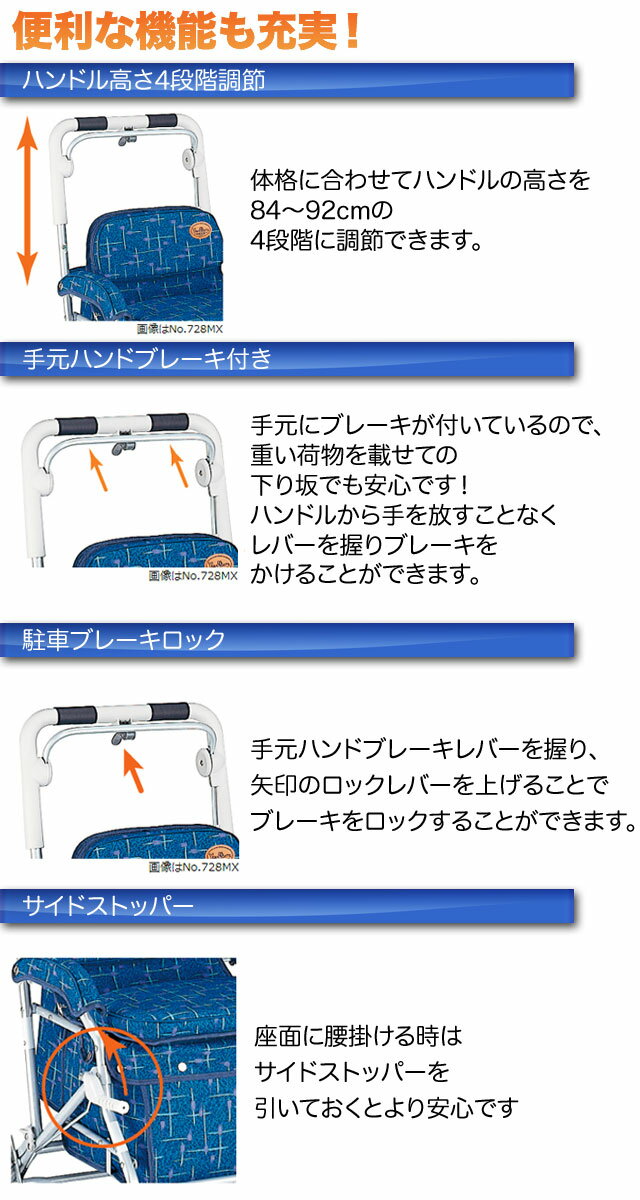 説明 大きな車輪でらくらく移動♪ 新柄あります全4色! 安心のレインカバー付き♪ ※こちらの商品は大きい前後輪タイプです ☆ハンドル高さ4段階 ☆ハンドブレーキ ☆駐車ブレーキロック ☆サイドストッパー ☆3WAYキャスター ☆小袋付き ☆足元ひろびろ設計 ☆かさつえホルダー ☆折りたたみ自立式 ☆レインカバー付き サイズ 本体:幅50×奥行64×高さ84〜92(cm) 折り畳み時:幅50×奥行27×高さ74(cm) ハンドル高さ:84〜92cm バッグ寸法: 幅31×上奥行25.5×下奥行32×高さ22(cm) 座面寸法:幅36×奥行30×高さ44(cm) 重量:約6.2kg 最大使用者体重:100kg 材質 ●材質 本体/アルミ・合成樹脂 車輪/EVA樹脂(17.5)cm ●バッグ材質 ポリエステル(防水加工) 積載量:8kg 内容量:約26L 備考 この製品は、高齢者の方の自立歩行をサポートする歩行補助のための手押し車。 お買い物時は、ショッピングカートとして、お散歩時はウォーキングをさせる杖代わりにお役立ていただけます。 さらに休憩時はイスへと早変わり。「外に出歩きたい」という思いにお応えします。 この製品は、リハビリテーション用ではありません。 万が一在庫がない場合は、追加入荷までお待ち頂く場合もございます。その際は、当店よりご連絡させて頂きますので予めご了承下さい。 離島、一部地域は別途送料がかかる場合がございます。 ご注文時には、足されておりませんが、後程、別途送料を足した金額を当店よりご連絡致します。 ご了承くださいませ。 ☆シルバーカー色々取り揃えています ☆その他の島製作所のシルバーカー ☆その他の幸和製作所のシルバーカー ☆その他の須恵廣工業のシルバーカー ☆その他の象印ベビーのシルバーカー≫シルバーカー 一覧はこちら! ▼ シルバーカーのタイプ別で探す!▼ ≫スタンダードタイプ ≫ミドルカータイプ(中型) ≫コンパクトカータイプ(軽量) ≫アルミカー ≫レインカバー付き ≫座れるタイプ ≫前輪3WAY スリーウェイ ≫前輪2WAY ツーウェイ ≫買い物かご受け有り ≫大容量 ≫男性用シルバーカー ≫サイドカー 一覧はこちら! ▼ サイドカーのタイプ別で探す!▼ ≫お買い物用 ≫旅行用 ≫360度回転キャスター ≫2WAYキャスター ≫3WAYキャスター ≫レインカバー付き ≫ステッキ 一覧はこちら! ▼ ステッキのタイプ別で探す!▼ ≫一本杖 ≫四点杖 ≫折りたたみ式杖 ▼ その他のおすすめ商品 ▼ ≫リクライニングチェア ≫手すり ≫歩行器・歩行車 ≫酸素ボンベカー