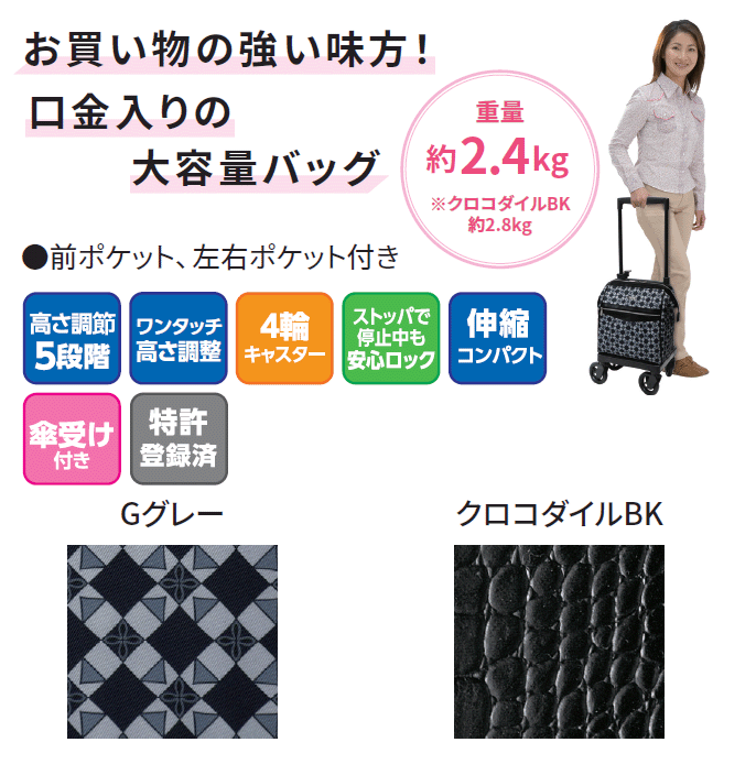 ●サイズ/約幅23.5×奥行34×高さ68〜84cm、収納時:約幅23.5×奥行34×高さ65cm●車輪サイズ/約前輪10×後輪10cm●重さ/Gグレー:約2.4kg、クロコダイルBK:約2.8kg●バッグ積載荷重/6kg●材質/本体:アルミ(アルマイト加工)、タイヤ:EVA、ホイル:PP、(バッグ表生地)クロコダイルBK:ビニールレザー・Gグレー:ポリエステル、保冷材:発泡ポリエチレン、裏生地:ナイロン●標準機能/ハンドル高さ調整、保冷バッグ ・4輪360度キャスターでスムーズな方向転換。・バッグは口金入りバッグ口が大きく開きやすい。・便利な駐車用ストッパー。・保冷仕様のバッグ。 【島製作所】メロディ スムーズKBR その他「シルバーカー」はこちら ≫