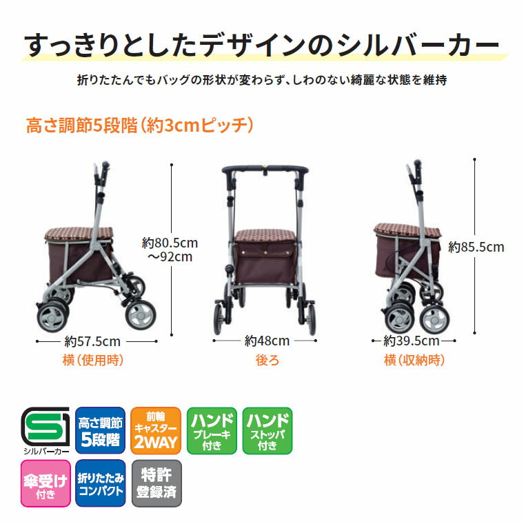 ●サイズ/幅48×奥行57.5×高さ80.5〜92(5段階/3cm)cm、折りたたみ時:奥行39.5×高さ83.5cm、座面:幅31.5×奥行33.5cm、座面高:46cm●車輪サイズ/前輪14.5×後輪14.5cm●重さ/5kg●材質/フレーム:アルミ、バッグ:ポリエステル●バッグ容量/18L●積載荷重/10kg●最大使用者体重/80kg●標準機能/折りたたみ、2WAYキャスター(左右60°・固定)、手元ブレーキ、駐車ブレーキ、座面、杖・傘立て●生産国/ベトナム●SGマーク取得商品・折りたたんでもバッグ形状が変わりません。・アルミフレームで軽量、持ち運び便利。・座面が前後から開けられる2WAYタイプ。・買い物カゴ受け付き。【島製作所】 [メーカー希望小売価格はメーカーカタログに基づいて掲載しています]カゴマート