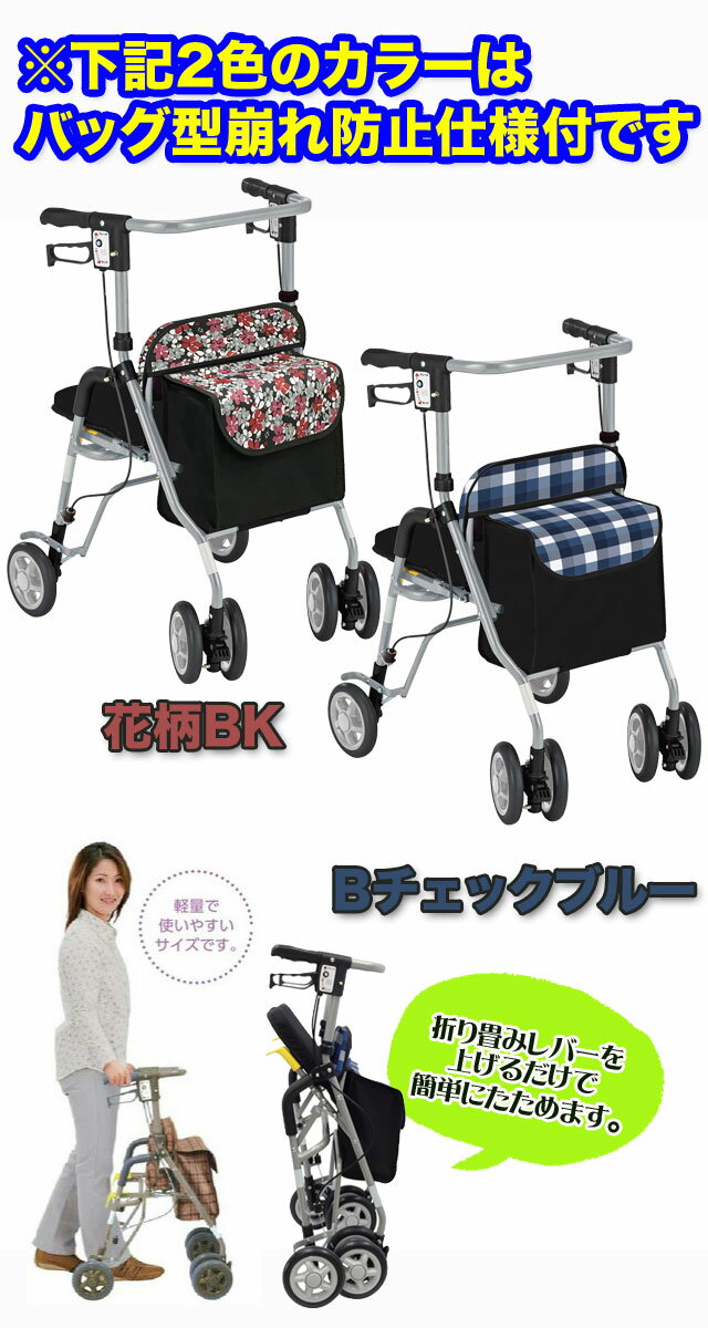 説明 コンパクトで使いやすい歩行車。 片方だけのブレーキ操作でも両後輪を制御できます! サイズ 使用時サイズ:高さ78.5〜88×幅50×奥行き56cm 収納時サイズ:高さ86.5×幅50×奥行き28.5cm ハンドル高:78.5〜88(cm) 高さ調節:4段階 ピッチサイズ 約3cm 座面の高さ:約41cm 座面サイズ:幅34.5×奥行27(cm) タイヤ直径:前輪 14.5cm 後輪 約14.5cm バッグ耐荷重:5Kg バッグサイズ:高さ26×幅30.5×奥行き14.5cm(外寸) 重量:約5.9kg ●最大使用者体重:100kg 材質 ●材質 本体部:アルミ(粉体塗装) タイヤ:EVA 備考 シルバーカーでの補助に不安を感じられる方には体幹を3方囲んでいる歩行車タイプをお勧めします。 お買い物というよりは、歩行重視・筋力保持を目的としている方にお勧めです。 ※型崩れ防止使用は新柄の『花柄BK』と『Bチェックブルー』の2色のみとなっております。※ 万が一在庫がない場合は、追加入荷までお待ち頂く場合もございます。その際は、当店よりご連絡させて頂きますので予めご了承下さい。 離島、一部地域は別途送料がかかる場合がございます。 ご注文時には、足されておりませんが、後程、別途送料を足した金額を当店よりご連絡致します。 ご了承ください。 ☆シルバーカー色々取り揃えています ☆その他の島製作所のシルバーカー ☆その他の幸和製作所のシルバーカー ☆その他の須恵廣工業のシルバーカー ☆その他の象印ベビーのシルバーカー≫シルバーカー 一覧はこちら! ▼ シルバーカーのタイプ別で探す!▼ ≫スタンダードタイプ ≫ミドルカータイプ(中型) ≫コンパクトカータイプ(軽量) ≫アルミカー ≫レインカバー付き ≫座れるタイプ ≫前輪3WAY スリーウェイ ≫前輪2WAY ツーウェイ ≫買い物かご受け有り ≫大容量 ≫男性用シルバーカー ≫サイドカー 一覧はこちら! ▼ サイドカーのタイプ別で探す!▼ ≫お買い物用 ≫旅行用 ≫360度回転キャスター ≫2WAYキャスター ≫3WAYキャスター ≫レインカバー付き ≫ステッキ 一覧はこちら! ▼ ステッキのタイプ別で探す!▼ ≫一本杖 ≫四点杖 ≫折りたたみ式杖 ▼ その他のおすすめ商品 ▼ ≫リクライニングチェア ≫手すり ≫歩行器・歩行車 ≫酸素ボンベカー
