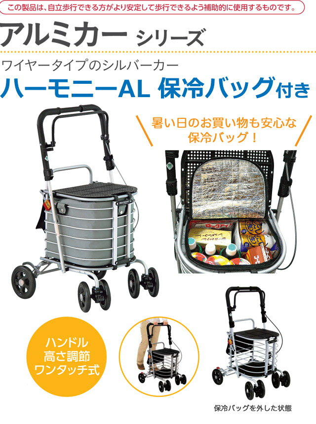 商品名 : \レビュー特典対象/シルバーカー ハーモニーAL ※保冷バッグ付き(グレー無地) 島製作所 軽量 おしゃれ アルミカー 折り畳み 手押し車 歩行補助車 母の日 敬老の日【最短発送】