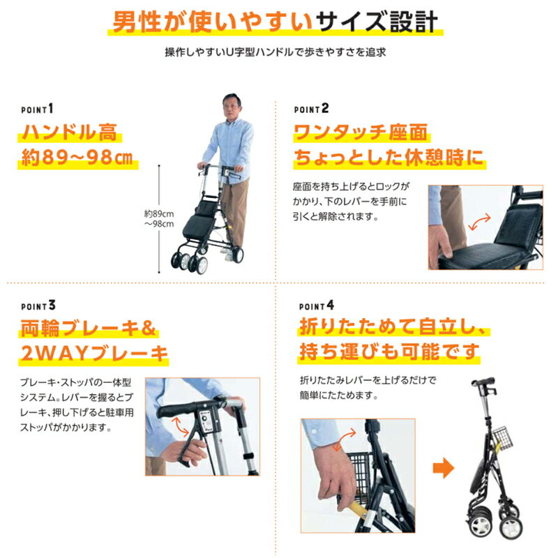・男性が使いやすいサイズ設計。U字ハンドルで歩きやすさを追求。 ・握るとブレーキ、押し下げると駐車ストッパ。 ・キャスターの回転を固定(0度)と方向転換もスムーズな左右各60度の回転を選んで使うことが可能。 ・取り外し可能のライト付き!点灯と点滅の切り替えが指で操作できます。 ・折りたためばコンパクトになり、持ち運びなどに便利。 ・小さな溝にはまりにくいよう後輪は太めの約5cmを採用!! ●サイズ/ 幅46×奥行61.5×高さ90〜99(4段階/3cm)cm、 折りたたみ時:奥行34×高さ98cm、 座面:幅27×奥行22cm、 座面高:47cm ●車輪サイズ/前輪14.5×後輪14.5cm ●重さ/4.8kg ●材質/フレーム:アルミ ●最大使用者体重/90kg ●カゴ容量/2L ●積載荷重/2kg ●標準機能/ 折りたたみ、2WAYキャスター(左右60°、固定)、 手元ブレーキ、駐車ブレーキ、座面、杖・傘立て ●生産国/ベトナム ●SGマーク取得商品 ●JANコード/ 4945528130197 ●メーカー名/島製作所