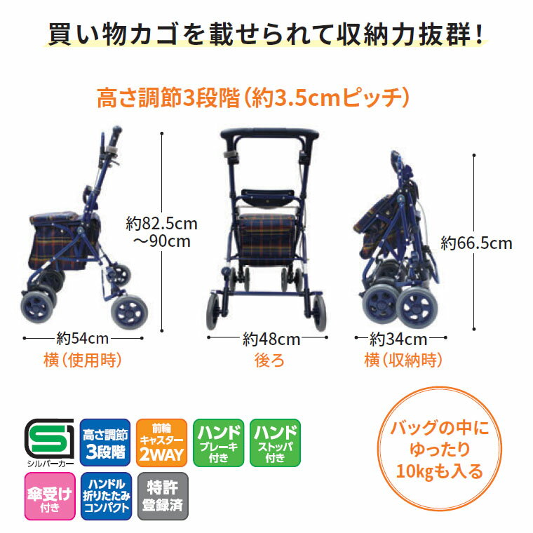 ●サイズ/幅48×奥行54×高さ82.5〜90cm、折りたたみ時:奥行34×高さ66.5cm、座面高47.5cm●車輪径/前輪15×後輪15cm●重量/5kg●バッグ容量/約12L●材質/本体:アルミ粉体塗装、シート:(花柄BR)ビニールレザー、(格子NB)ポリエステル、タイヤ:EVA●最大使用者体重/80kg●歩行車SGマーク取得商品 ・コンパクトながら大容量。さらに、便利な買い物カゴ置き付き。・買い物カゴが置けます。 【島製作所】 [メーカー希望小売価格はメーカーカタログに基づいて掲載しています] 【当店では以下のような商品を取り扱っております。】 [食事関連] 介護食 健康食品 栄養補助食品 ハイカロリー 区分1 区分2 区分3 区分4 容易にかめる 歯ぐきでつぶせる 舌でつぶせる かまなくてよい ドリンク お箸 スプーン フォーク グリップ カフ 食器類 すべり止めシート カップ吸い飲み器 調理器具 オーブナー ロ腔ケア用品 食事用エプロン 飲料 飲み物 栄養補助ゼリー ゼリー飲料 自助具 カトラリー コップ お皿 オーラルケア 歯ブラシ 歯ぶらし 歯磨き 入れ歯洗浄 食事用前掛け [入浴関連] シャワーチェア 浴槽台 浴槽手すり 浴槽ポード バスリフト バスマット バスシート シャワーキャリー 入浴用 介助ベルト すのこ 入浴用クッション 防水力バー エプロン 入浴エプロン 介助用エプロン シューズ シャワー付チェア 簡易浴槽 入浴用担架 入浴用小物 入浴剤 清拭料 ボディーソープ シャンプー 保湿剤 清拭タオル 風呂いす お風呂椅子 バスボード シャワー用車いす 入浴介助エプロン お風呂マット 滑り止めマット すべり止め 転倒予防 クッション 業務用入浴剤 ドライシャンプー ウェットタオル [ベッド関連]べッド サイドレール サイドテーブル べッド用手すり カバー 衝撃吸収マット 枕 寝具 エアマット マットレス オーバレイ 介助ベルト 移乗用具 移乗グロープ 介護リフト シーツ 防水 除湿 非防水 べッドバッド 体位変換クッション セーフティー用品 電動ベッド 介護ベッド 介助バー Pバー ピロー 介護クッション ベッド柵 転倒予防 座位保持 端座位 床ずれ用品 褥瘡 除圧 [衣類] 寝巻き 肌着 衣類 紙おむつホルダー 失禁バンツ 防寒具 帽子ソックス サポーター コルセットルームウェア アンダーウェア 下着 トップス ボトムス アウター チュニック ベスト カーディガン 羽織り 寒さ対策 軽失禁パンツ 尿漏れパンツ 靴下 くつした サポーター 腰用 膝用 足用 足首 背中 手首 肩 肘 [歩行関連] 車いす 電動車いす 車いす用クッション 座位保持用具 車いす用小物 スロープ 電動昇降機 歩行車 歩行器 シルバーカー ショッピングカート ウォーキングボール 杖 多点杖 松葉杖 クラッチ 杖小物 ゴムチップ リハビリシューズ 靴下 靴した ソックス スリッパ 室内履き 外履き 入院 施設用 病院用 シューズ シューズ小物 転倒予防 ヘッドガード 車いす用オプション 歩行補助器 四輪 手押し車 カート 買い物カート シニアカー ステッキ 四点杖 4点杖 杖先ゴム 介護シューズ コンフォートシューズ ウォーキングシューズ ヘッドギア 頭部保護帽 帽子 車椅子体重計 [排泄関連]ポータブルトイレ プライベートスクリーン 簡易便座 トイレ用手すり 補高便座 便座シート トイレマット トイレ用雑貨 消臭剤 汚物処理用品 紙おむつ おむつ オムツ パッド 尿取りパッド 尿器 おしり洗浄液 シャワーポトル おしりふき 紙おむつ処理袋 採尿器 差込便器樹脂製トイレ 木製トイレ 家具調トイレ 目隠しスクリーン トイレ用手摺り 補高補助便座 トイレシート 消臭フォーム 消臭スプレー おむつ処理袋 尿漏れパッド サニタリー用品 トイレットペーパー シングル ダブル 使い捨て [住宅改修]玄関台 段差解消スロープ すべり止め小物 取っ手 玄関用へンチ 置き型手すり 玄関用手すり 手すり部材 浴室用手すり 部材段さ解消 滑り止め 上がりかまち 框用 手摺り 踏み台 [日常生活]階段昇降機 立ち上がり補助いす 電動昇降いす 座いす サポートアイテム リーチャー はさみ ルーベ 爪切り 爪やすり 腕時計 助聴器 補聴器 集音器 コミュニケーション機器 見守り 報知装置 ヒーリング座椅子 電動昇降椅子 リクライニングチェア [健康管理]レクリエーションアイテム トレーニングアイテム 平行棒 トレーニングマシン マッサージ機 温冷具 クッション 円座クッション ルームランナー ランニングマシン 電動ウォーカー トレッドミル クロスバイク ぶら下がり健康器 マッサージチェア ビーズクッション 低反発クッション [医療・施設]吸引器 体温計 非接触 血圧計 温湿度計 歩数計 体重計 車いす用体重計 ホットキャビ 回診車 ランドリーカート ボディベッド ゴミ容器 プライベートスクリーン 施設用いす テープル チェスト 床頭台 施設用 畳製品 ストレッチャー 担架 薬カレンダー 薬入れ 薬用小物 点眼用品 腹帯 メディカルケア 保湿クリーム 手袋 使い捨てエプロン マスク 感染対策用品 バッグ お薬手帳カバー衣類 ユニフォーム 疑似体験セットネブライザー ヘルスメーター オフィス家具 投薬管理用品 [住環境用品] ハ