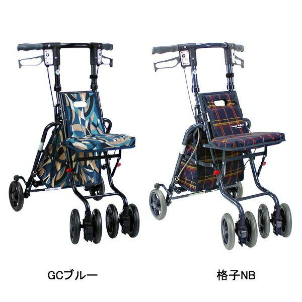 ・アルミフレームで軽量、持ち運びに便利 ・ワンタッチでハンドル部から折りたためる楽々タイプ ・前輪キャスター付で方向転換もスムーズ ・操作しやすいU字型ハンドルで歩きやすさを追求 ・便利な機能も充実 ・左右どちらでも両輪ブレーキ&2WAYブレーキ 片方だけのブレーキ操作でも両後輪を制御できます。 ブレーキ・ストッパの一体型システム。 レバーを握るとブレーキ、押し下げると駐車用ストッパがかかります。 ・操作しやすいU字型ハンドル U字型なので安定した歩行ができます。 ・折りたたみ可能 折りたためばコンパクトになり、持ち運びにも便利です。 折りたたんだ状態でも自立します。 ※この製品は、自立歩行ができる方がより安定して歩行できるように補助的に使用するものです。 ●サイズ/ 幅48.5×奥行59×高さ79〜85(3段階/3cm)cm 折りたたみ時:奥行35×高さ65cm 座面:幅27.5×奥行20cm 座面高:44cm ●車輪サイズ/前輪14.5×後輪14.5cm ●重さ/4.8kg ●材質/ 本体部:アルミ(粉体塗装) タイヤ:EVA ホイル:PP バッグ:ポリエステル ●最大使用者体重/80kg ●バッグ容量/約5L ●積載荷重/2kg ●標準機能/折りたたみ、2WAYキャスター(左右60°、固定)、手元ブレーキ、駐車ブレーキ、座面、杖・傘立て ●生産国/ベトナム ●SGマーク取得商品 ●カラー/GCブルー 格子NB ダマスクピンク フローラルBE ●JANコード/ GCブルー:4945528232815 格子NB:4945528232068 ダマスクピンク:4945528232877 フローラルBE:4945528232891 ●メーカー名/島製作所「サニーウォーカー」一覧はこちらです。