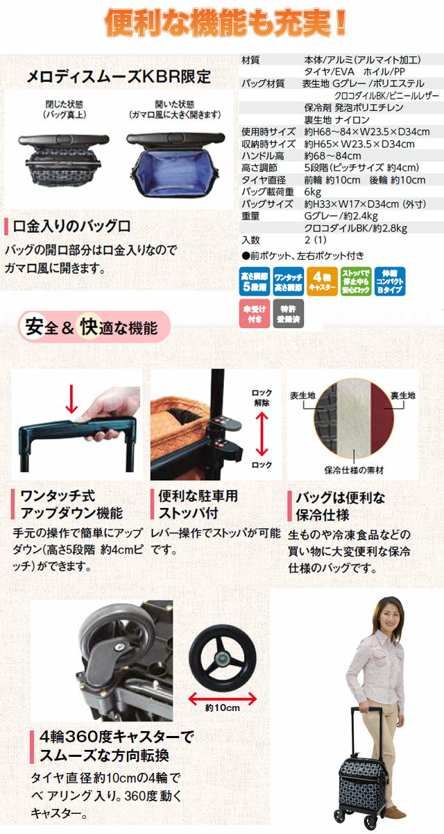 説明 アルミフレームで軽量、持ち運びに便利。 タイヤ直径約10の4輪でベアリング入り、360度回転キャスターで動きがスムーズ。生ものや冷凍食品などのお買い物に大変便利な保冷仕様のバッグはガマ口風に大きく開き、荷物の出し入れが簡単。 扱いやすいショッピングカートです。 サイズ 使用時サイズ:H約68〜84×W23.5×D34(cm) 収納時サイズ:H約65×W23.5×D34(cm) ハンドル高さ:約68〜84cm 高さ調節:5段階(ピッチサイズ 約4cm) バッグサイズ:約H33×W17×D34(cm)(外寸) バッグ耐荷重:6Kg 重量:Gグレー/約2.4kg クロコダイルBK/約2.8kg タイヤ直径 前輪:約10cm 後輪:約10cm 材質 ●材質 本体:アルミ(アルマイト加工) タイヤ:EVA(硬質発泡車輪) ホイル:PP ●バッグ材質 表生地:Gグレー/ポリエステル クロコダイルBK/ビニールレザー 保冷材:発泡ポリエチレン 裏生地:ナイロン 備考 お買い物時は、ショッピングカートとして、お役立ていただけます。 この製品は、リハビリテーション用ではありません。 万が一在庫がない場合は、追加入荷までお待ち頂く場合もございます。その際は、当店よりご連絡させて頂きますので予めご了承下さい。 離島、一部地域は別途送料がかかる場合がございます。 ご注文時には、足されておりませんが、後程、別途送料を足した金額を当店よりご連絡致します。 ご了承ください。 ☆シルバーカー色々取り揃えています ☆その他の島製作所のシルバーカー ☆その他の幸和製作所のシルバーカー ☆その他の須恵廣工業のシルバーカー ☆その他の象印ベビーのシルバーカーレインカバーはご一緒にいかがでしょうか? ★対応商品はこちら↓ 【Sサイズ】ショッピングカート用レインカバー 【単品】 ≫シルバーカー 一覧はこちら! ▼ シルバーカーのタイプ別で探す!▼ ≫スタンダードタイプ ≫ミドルカータイプ(中型) ≫コンパクトカータイプ(軽量) ≫アルミカー ≫レインカバー付き ≫座れるタイプ ≫前輪3WAY スリーウェイ ≫前輪2WAY ツーウェイ ≫買い物かご受け有り ≫大容量 ≫男性用シルバーカー ≫サイドカー 一覧はこちら! ▼ サイドカーのタイプ別で探す!▼ ≫お買い物用 ≫旅行用 ≫360度回転キャスター ≫2WAYキャスター ≫3WAYキャスター ≫レインカバー付き ≫ステッキ 一覧はこちら! ▼ ステッキのタイプ別で探す!▼ ≫一本杖 ≫四点杖 ≫折りたたみ式杖 ▼ その他のおすすめ商品 ▼ ≫リクライニングチェア ≫手すり ≫歩行器・歩行車 ≫酸素ボンベカー