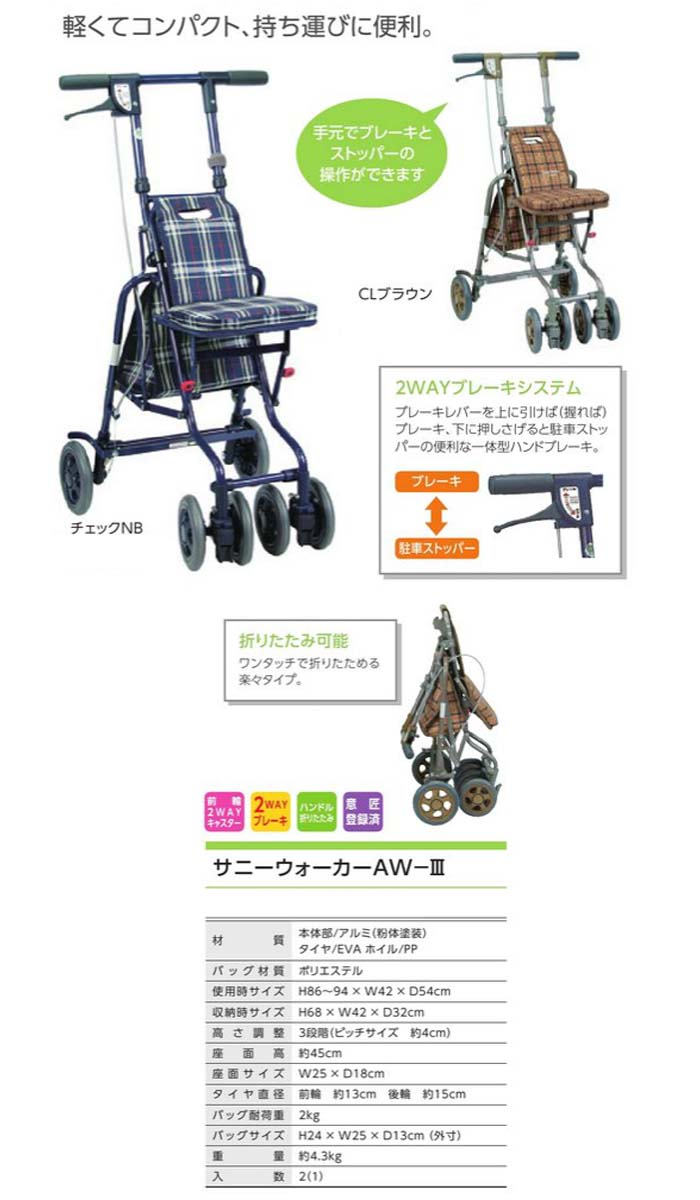 この商品と関連のある商品サニーウォーカーAW-III (チェックNB)島製作所 サニーウォーカーAW-III (CLブラウン)島製作所 サニーウォーカーAW-III (CLブラウン)■持ち運びにも便利!軽くてコンパクトなシルバーカー。■2WAYブレーキシステム ブレーキレバーを上に引けば(握れば)ブレーキ 下に押し下げると駐車ストッパーの便利な一体型ハンドブレーキ。※カラーは、CLブラウン です。●サイズ 幅42×奥行54×高さ86〜94(3段階/4cmピッチ)cm 折りたたみ時:幅42×奥行32×高さ68cm 座面:幅25×奥行18cm 座面高:45cm●車輪サイズ 前輪13×後輪15cm●重さ 4.3kg●バッグ容量 約4L●バッグ耐荷重 2kg●材質 本体:アルミパイプ(粉体塗装) バッグ:ポリエステル タイヤ:EVA硬質発泡車輪●最大使用者体重 80kg●標準機能 折りたたみ式、2WAYキャスター(左右60°、固定)●SGマーク取得商品※こちらの商品はメーカー(提携先)からの直送となります。欠品時には納期にお時間をいただく場合が ございますのでお手数ですが急ぎの場合はお問い合わせ下さい。注文について注意事項メーカー(提携先)からの直送となります。稀ではございますが欠品時は変動する場合もございますので、正確な納期はご注文の確認メールにてご案内させていただきます。