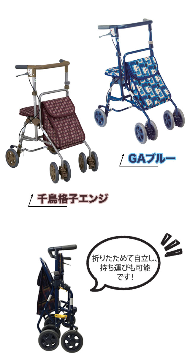 説明 ゆったり設計で歩きやすく、荷物もたっぷり収納可能。 折りたたみ可能。 サイズ 使用時サイズ:高さ80〜86×幅45.5×奥行58.5(cm) 収納時サイズ:高さ68×幅45.5×奥行29(cm) ハンドル高:80〜86(cm) 高さ調節:3段階(ピッチサイズ 約3cm) 座面高:約44cm 座面サイズ:幅31×奥行24(cm) タイヤ直径:前輪 約15cm 後輪 約15cm バッグ耐荷重:10Kg バッグサイズ:高さ31×幅26.5×奥行16cm(外寸) 重量:4.3kg 材質 ●材質 本体:アルミ(粉体塗装) タイヤ:EVA ●バッグ材質 ポリエステル 備考 この製品は、高齢者の方の自立歩行をサポートする歩行補助のための手押し車。 お買い物時は、ショッピングカートとして、お散歩時はウォーキングをさせる杖代わりにお役立ていただけます。 さらに休憩時はイスへと早変わり。「外に出歩きたい」という思いにお応えします。 この製品は、リハビリテーション用ではありません。 万が一在庫がない場合は、追加入荷までお待ち頂く場合もございます。その際は、当店よりご連絡させて頂きますので予めご了承下さい。 離島、一部地域は別途送料がかかる場合がございます。 ご注文時には、足されておりませんが、後程、別途送料を足した金額を当店よりご連絡致します。 ご了承ください。 ☆シルバーカー色々取り揃えています ☆その他の島製作所のシルバーカー ☆その他の幸和製作所のシルバーカー ☆その他の須恵廣工業のシルバーカー ☆その他の象印ベビーのシルバーカーレインカバーはご一緒にいかがでしょうか? ★対応商品はこちら→シルバーカー用レインカバー【単品】 ≫シルバーカー 一覧はこちら! ▼ シルバーカーのタイプ別で探す!▼ ≫スタンダードタイプ ≫ミドルカータイプ(中型) ≫コンパクトカータイプ(軽量) ≫アルミカー ≫レインカバー付き ≫座れるタイプ ≫前輪3WAY スリーウェイ ≫前輪2WAY ツーウェイ ≫買い物かご受け有り ≫大容量 ≫男性用シルバーカー ≫サイドカー 一覧はこちら! ▼ サイドカーのタイプ別で探す!▼ ≫お買い物用 ≫旅行用 ≫360度回転キャスター ≫2WAYキャスター ≫3WAYキャスター ≫レインカバー付き ≫ステッキ 一覧はこちら! ▼ ステッキのタイプ別で探す!▼ ≫一本杖 ≫四点杖 ≫折りたたみ式杖 ▼ その他のおすすめ商品 ▼ ≫リクライニングチェア ≫手すり ≫歩行器・歩行車 ≫酸素ボンベカー