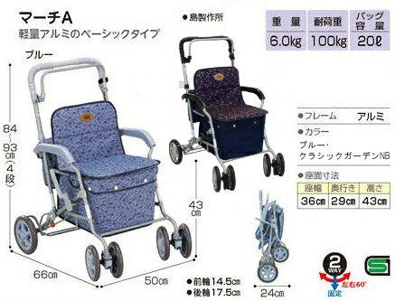 商品情報メーカー島製作所サイズ幅50×高さ84〜93(4段階)×奥行き66cm折り畳み時:24cm座面:幅36×高さ43×奥行き29cm重量6.0kgバッグ容量20L耐荷重100kgカラーブルークラシックガーデンNBタイヤ直径前輪:14.5cm後輪:17.5cm【マーチA】 島製作所 シルバーカー ★送料無料★ 歩行/介護/介護用品/福祉用具/折りたたみ/自立/収納/ボックスカー/高齢者/プレゼント/敬老の日/お買い物/アルミ/軽量/ ★車体が広く安定性が良い、座面が広く座り心地が抜群なスタンダートなタイプです。★ 座面下に大きな収納スペースがあり、お買い物などに便利♪★前だけではなく、後ろにも小バッグがあります♪★カラーは2種類から選べます♪ ブルー/クラシックガーデンNB 2