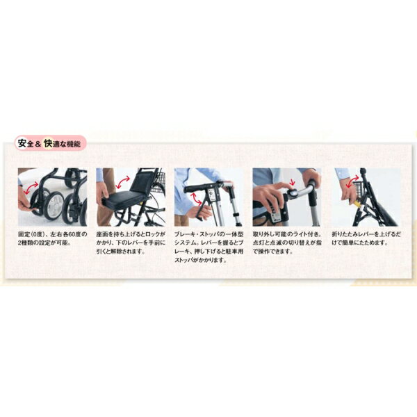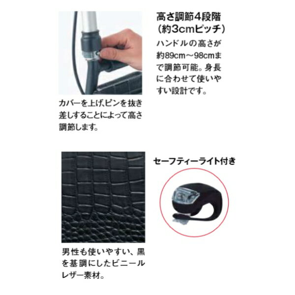 【返品種別A】□「返品種別」について詳しくはこちら□※製品安全協会認定安全基準合格品。◆男性が使いやすいサイズ設計のシルバーカー。◆操作しやすいU字型ハンドルで歩きやすさを追求。◆座りやすいよう座面は大きめに、最大使用者重量も90kgまでOK。◆夜のお出かけも安心のLEDライト付き(脱着可能)。◆ブレーキ・ストッパの一体型システムです。◆小さな溝にはまりにくいよう後輪は太めの約5cmを採用。◆黒を基調にしたシックなデザインで、男性も使用しやすくなっています。■ 仕 様 ■使用時サイズ(約):幅46×奥行61.5×高さ90〜99cm収納時サイズ(約):幅46×奥行34×高さ98cmカゴ外寸(約):幅23×奥行9×高さ12cmハンドル高さ(約):89〜98cm座面サイズ(約):幅27×奥行22cm座面高(約):47cm高さ調節:4段階ピッチサイズ(約):3cmタイヤ径(約):前輪14.5cm、後輪14.5cmカゴ載荷重(約):2kg最大使用者体重(約):90kg重量(約):4.8kg材質・・・本体:アルミ(粉体塗装)タイヤ:EVAホイル:PPカゴ:スチール座面・背もたれ:ビニールレザーセーフティーライト(ゴム部分):TPEライト部分:LED、プラスチック[563855NISHIKAWA]島製作所美容・健康家電>介護・医療用品