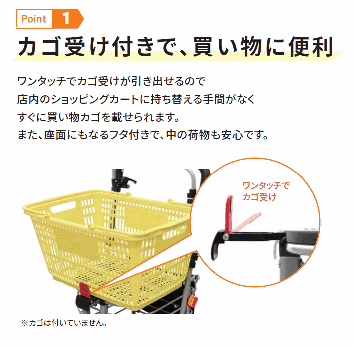 ●サイズ/幅45×奥行54×高さ86.5〜94.5(3段階/4cm)cm、折りたたみ時:奥行32×高さ95.5cm、座面:幅32×奥行30cm、座面高:49cm●車輪サイズ/約前輪14.5×後輪14.5cm●重さ/約5.3kg●材質/フレーム:アルミ、バッグ:ナイロン●バッグ容量/25L●積載荷重/10kg●最大使用者体重/80kg●標準機能/折りたたみ、2WAYキャスター(左右60°・固定)、手元ブレーキ、駐車ブレーキ、座面、杖・傘立て●生産国/ベトナム●SGマーク取得商品・アルミフレームで軽量、折りたたみ時自立。・ふた・カゴ受け付きで買い物や荷物も安心。・前輪2WAYキャスターで方向転換もスムーズ。・ハンドブレーキ、手元駐車用ストッパー付き。【島製作所】
