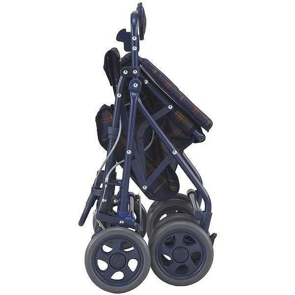 ・コンパクトながら大容量。さらに、便利な買い物カゴ置き付。 ・買い物カゴが置けます。 ●サイズ/幅48×奥行54×高さ82.5〜90(3段階/3.5cm)cm、折りたたみ時:奥行34×高さ66.5cm、座面:幅28×奥行19.5cm、座面高:47.5cm ●車輪サイズ/前輪15×後輪15cm ●重さ/5kg ●材質/フレーム:アルミ(粉体塗装)、バッグ:(格子NB)ポリエステル・(花柄BR)ビニールレザー ●最大使用者体重/80kg ●バッグ容量/約12L ●積載荷重/10kg ●標準機能/折りたたみ、2WAYキャスター(左右60°、固定)、手元ブレーキ、駐車ブレーキ、座面、杖・傘立て ●SGマーク取得商品
