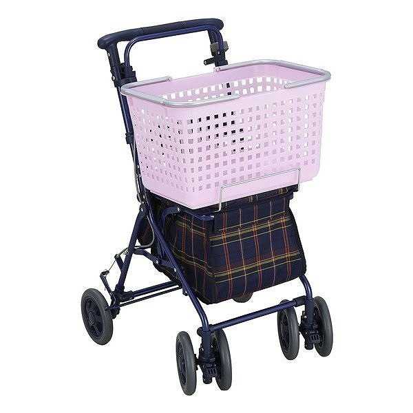 ・コンパクトながら大容量。さらに、便利な買い物カゴ置き付。 ・買い物カゴが置けます。 ●サイズ/幅48×奥行54×高さ82.5〜90(3段階/3.5cm)cm、折りたたみ時:奥行34×高さ66.5cm、座面:幅28×奥行19.5cm、座面高:47.5cm ●車輪サイズ/前輪15×後輪15cm ●重さ/5kg ●材質/フレーム:アルミ(粉体塗装)、バッグ:(格子NB)ポリエステル・(花柄BR)ビニールレザー ●最大使用者体重/80kg ●バッグ容量/約12L ●積載荷重/10kg ●標準機能/折りたたみ、2WAYキャスター(左右60°、固定)、手元ブレーキ、駐車ブレーキ、座面、杖・傘立て ●SGマーク取得商品