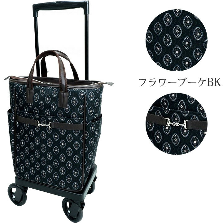 NEW! あると便利なコンパクト車いすの新商品フロントのビット金具がおしゃれなワンポイント○取り外しが簡単なバッグバッグは背面にあるボタンで固定されており、簡単に取り外しができます。バッグだけで持ち歩くこともできて便利です。○用途に合わせたポケット・取り出しやすいよう浅めの仕様の前ポケット・500mLのペットボトルなど縦長の物が入るサイドポケット・内ポケットはA4サイズがすっぽり入るサイズ○便利な保冷仕様生ものや冷凍食品などの買い物に便利な保冷仕様のバッグです。○高さ調節5段階手元で簡単に持ち手の高さを調節できます。○ストッパーで停止中も安心ロックレバーを上げ下げするだけで駐車ブレーキがかかります。○スムーズ&安定感のあるキャスター直径約10cmの大き目のキャスターで安定感があります。360度どの方向にも軽やかに動きます。○便利な傘受け&傘止めバンド付き下部に傘受けが付いています。先端が17mm未満の傘が入ります。上部の傘止めバンドで固定できるので、傘が倒れることなく安全に持ち歩けます。※こちらの商品はショッピングカートです。歩行を補助するものではありません。<材質>本体:アルミタイヤ:EVAホイル:PPバッグ材質表生地:ポリエステル裏生地:ナイロン発砲ポリエチレン仕様表詳細サイズ:幅39×奥行23.5×高68〜84cm重量:約2.7kg収納時サイズ:幅39×奥行2.5×高59cmバッグサイズ:h場39×奥行18×高39cm(外寸)バッグ載荷重:8kgタイヤ直径:約10cm規格1台