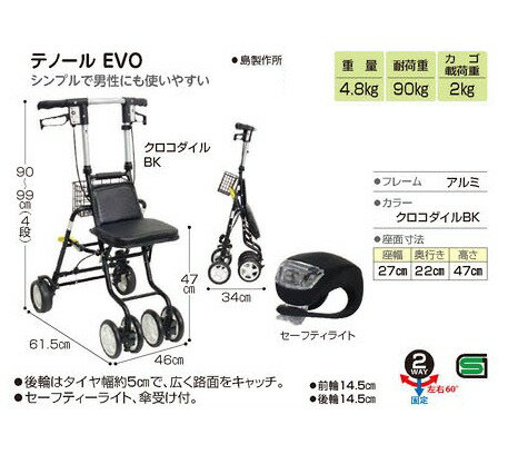商品情報●メーカー島製作所●サイズ幅46×高さ90〜99(4段階)×奥行き61.5cm折り畳み時:奥行き34cm座面:幅27×高さ47×奥行き22cm●重量4.8kg●カゴ載荷重2kg●耐荷重90kg●カラークロコダイルBK●タイヤ直径前輪:14.5cm後輪:14.5cm【テノール EVO】 島製作所 シルバーカー 軽量タイプ ★送料無料★ 軽量/歩行/シルバーカー/コンパクトタイプ/介護/介護用品/福祉用具/コンパクト/座れる/男性/背が高い/折りたたみ/簡単/高さ調節/歩行器/歩行車/送料無料/ ★シンプルで男性にも使いやすい♪★背の高い女性にもオススメです♪★操作しやすいU字型ハンドルです。★後輪は太さ5cmで、小さな溝にはまりにくい!★折りたたみレバーをあげるだけで、簡単に折りたためます。★傘受け、夕方のお出かけに便利なセーフティーライト付き♪ 2