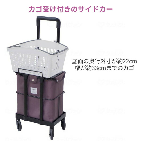 ※買い物カゴの形状によっては載せることができない場合がございます。 ※買い物カゴは付いていません。 ・カゴ受け付きのサイドカー。 ・コンビニなどで使用する小さい買い物カゴを載せることが可能 載せることができるカゴの大きさは底面の奥行外寸が約22cm、幅が約33cmまでです。 ・ワンタッチ式アップダウン機能 手元の操作で簡単にアップダウン(7段階/約4cm)ができます。 ・便利な駐車用ストッパ付き ストッパを足で踏むだけでロックや解除ができます。 ・4輪360°キャスターでスムーズな方向転換 ベアリング入りで360°軽やかに動くキャスター。 ・音鳴りがしにくい車輪 地面に接地するタイヤは、スポーツシューズのソールなどで使用されている素材(EVA)で音鳴りがしにくいです。 車輪は約9cmと大きく、軽やかに製品を押すことができます。 ●カラー/ グレイッシュローズ、スモーキーブルー ●サイズ/幅26.5×奥行35×高さ約67〜91(7段階/約4cm)cm ●車輪サイズ/前輪9×後輪9cm ●重さ/約3kg ●材質/フレーム:アルミ(電着塗装)、バッグ:綿(PVCコーティング) ●バッグ容量/23L ●積載荷重/8kg ●標準機能/1WAYキャスター(360°)、駐車ブレーキ ●生産国/中国 ●JANコード/ グレイッシュローズ:4945528351783 スモーキーブルー:4945528351790 ●メーカー/島製作所