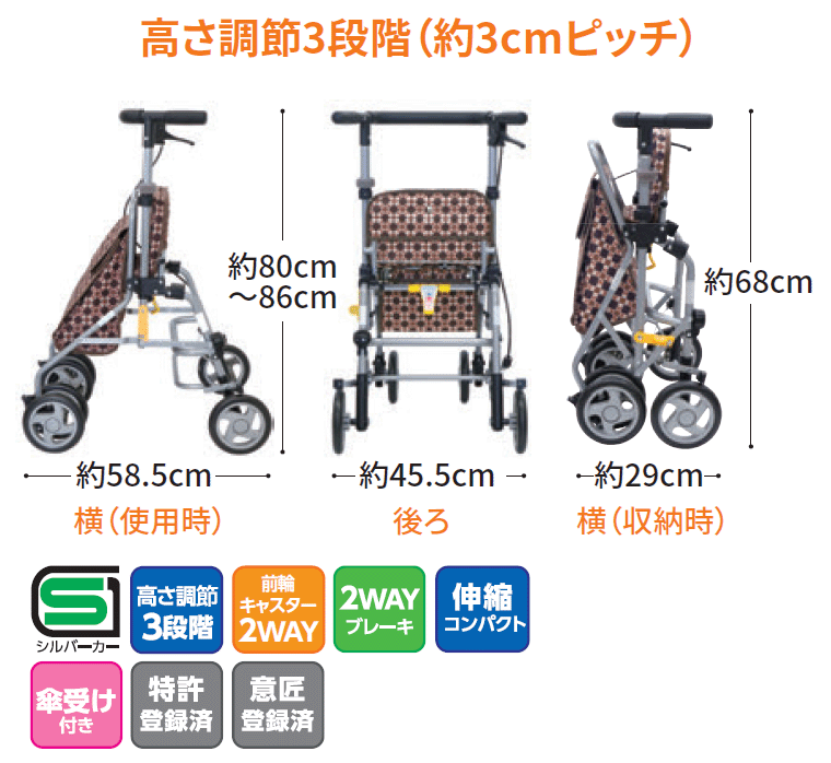 ●サイズ/幅45.5×奥行58.5×高さ80〜86(3段階/3cm)cm、折りたたみ時:奥行29×高さ68cm、座面:幅31×奥行24cm、座面高:約44cm●車輪サイズ/前輪15×後輪15cm●重さ/約4.3kg●バッグ容量/約10L●積載荷重/10kg●材質/本体:アルミ(粉体塗装)、タイヤ:EVA、バッグ:ポリエステル●最大使用者体重/80kg●生産国/台湾●標準機能/折りたたみ式、2WAYキャスター(左右60°・固定)、杖・傘置き付●SGマーク取得商品 ・ゆったり設計で、荷物もたっぷり収納。街歩きスタビリティーカー。・握るとブレーキ、押し下げると駐車ストッパーの2WAY&片方で両輪ブレーキ。 【島製作所】フォルテライト その他シルバーカーはこちら ≫