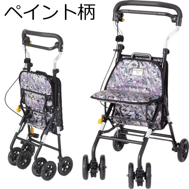NEW! あると便利なコンパクト車いすの新商品○カーブハンドル採用のキュートミニが前輪W車輪で、綺麗な柄模様で登場です。○軽くて小さく、使い勝手の良いスマートタイプ!○新型ハンドルは操作性が良く、身体を支えやすい構造になっています○新タイプ開閉式を採用し、簡単にコンパクトに折りたため、持ち運びに適しています○楽に操作できる手元ブレーキ、手元ストッパーを採用○前輪に3Wayキャスター(直進、左右40°、360°)採用でお好みのモードで使用できます○身体に合わせてハンドル高さが5段階に調節できます○持ち運び易いように、取手が付いています○握りやすい質感アップのハンドル手巻き採用○押し易いカーブハンドル○収納寸法:W40×D26×H87cm○座面高さ:45cm○耐荷重:100kg○積載重量:後袋3.0kg(袋サイズ W26×D11×H30cm)<素材>○袋部:綿(樹脂コーティング)○車体部:アルミ仕様表詳細認定マーク:SGマーク ○完成寸法:W40×D52×H82:85:88:91:94cm(5段階) ○本体重量:3.9kg 規格1台 ケンクル(kenkul)では他にも多くのシルバーカーをご用意しています 軽量で持ち運びに便利お散歩にも最適大きめの袋やかごが付いてお買い物に便利幅が広めでしっかりとした安定感がある体重を支えながら移動できる