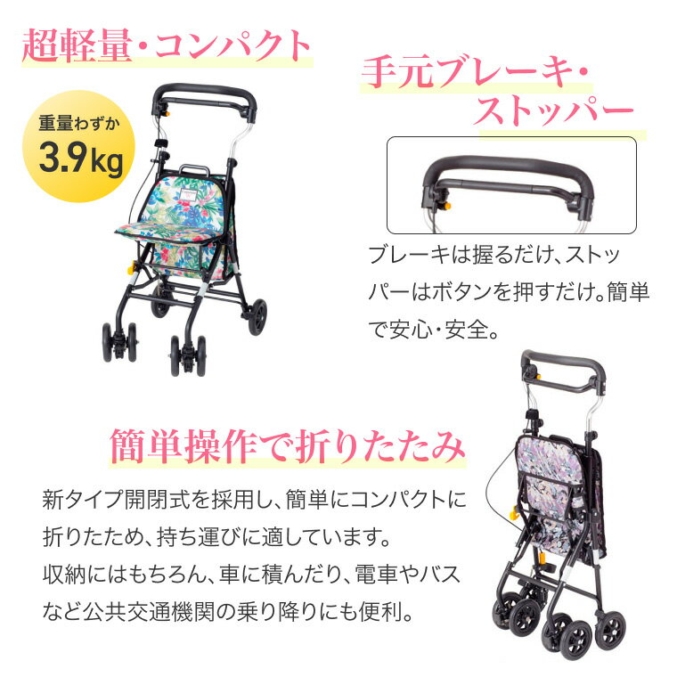 ●サイズ/幅40×奥行52×高さ82〜94(5段階/3cm)cm、折りたたみ時:奥行26×高さ87cm、座面:幅31×奥行21cm、座面高:45cm●車輪サイズ/前輪13×後輪13cm●重さ/3.9kg●材質/フレーム:アルミ、バッグ:(フラワー)綿・PVC・(ペイント)ポリエステル●バッグ容量/8.7L●積載荷重/3kg●最大使用者体重/100kg●標準機能/折りたたみ、3WAYキャスター(360°・左右40°・固定)、手元ブレーキ、駐車ブレーキ、座面、杖・傘立て●生産国/台湾●SGマーク取得商品・軽くて小さく、使い勝手のよいスマートタイプ。・操作方法がわかりやすく、単純。・座席の上げ下げだけで車体の開閉ができます。・手元ブレーキ、駐車ストッパーボタンで楽な操作ができます。※手すりなどを使わないと自立歩行できない方の使用は止めてください。※段差やミゾなどを越えるときは充分に注意してください。【ウィズワン】
