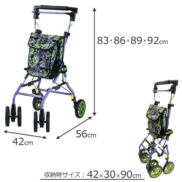 色違いはこちら『Fピンク』『Fヴァイオレット』NEW! あると便利なコンパクト車いすの新商品ファッションに進化したおしゃれなシルバーカー(日本製)これまでにないバッグの色・柄・折りに徹底的にこだわって作られています。バッグのカラーは新色『モノトーン』。『Fピンク』『Fヴァイオレット』はこちらまるでシルクのような光沢のある糸がジャガード織りになっており、立体感があります。どちらのカラーも高級感がいっぱいのバッグに仕上がっています。○軽量○ワンタッチ折りたたみワンタッチでコンパクトに折りたためます。○ハンドル4段階身体に合わせて、ハンドルの高さを4段階(83・86・89・92cm)に調節が可能です。○デラックスカーブハンドル両端は滑り止め加工。左右に操作しやすく、中央にはクッションが付いていて、握りやすさと走行性に優れています。○コンパクトシート小さくても安心して座れます。○ブレーキ調整手元ブレーキがききにくくなったら、ねじを回して簡単に調節ができます。○駐車用ボタン式ストッパー一時停止のストッパーはボタンを押すだけ。○手元ロック解除ストッパーロック時、手元ブレーキレバーを握るだけでロックを解除します。○3wayキャスター40キャスターの動く角度が、直進、左右40°、360°の3通りから選べる新型のキャスターです。○安心の反射板付き○つえ・傘立て付き○SGマーク【仕様】サイズ:幅42×奥56×高83・86・89・92cm座面サイズ:幅27×奥23cm座面高:44cm前バッグサイズ/容量/積載重量:幅19×奥8×高26cm/4L/2kg後バッグサイズ/容量/積載重量:幅18×奥4×高23cm/1.6L/1kg折りたたみサイズ:幅42×奥30×高90cm重量:4.0kg最大使用者体重:100kg前輪キャスター:固定、左右40°、360°生産国:日本<<材質>>本体:アルミタイヤ:EVAホイール:PP袋/座面:ポリエステル ケンクル(kenkul)では他にも多くのシルバーカーをご用意しています 軽量で持ち運びに便利お散歩にも最適大きめの袋やかごが付いてお買い物に便利幅が広めでしっかりとした安定感がある体重を支えながら移動できる