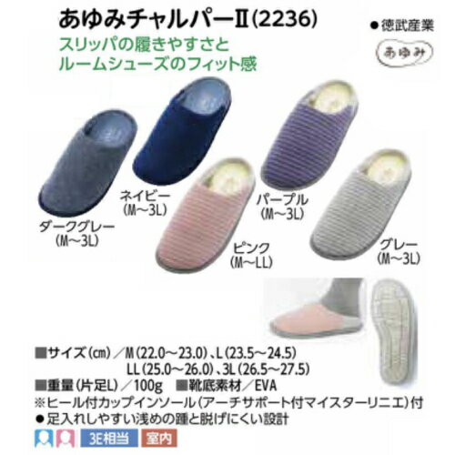 商品情報メーカー徳武産業サイズMLLL3L重量100g(片足L)靴底素材EVAカラーピンクグレーパープルネイビーダークグレーその他室内用男女兼用【あゆみ チャルパー2(2236)】両足販売 M〜3L 3E 徳武産業 室内履き ルームシューズ オススメ 男女兼用 部屋 室内用 靴 介護靴 介護 シューズ 仕事用 ヘルパー 柔らかい 履きやすい 婦人 紳士 男 女 介助 普段使い リハビリ靴 高齢者 プレゼント スリッパ スリッパ派ですが、スリッパは危ないと思われている方へ(2cm程のかかとが秘密)★スリッパの履きやすさと、ルームシューズのフィット感!★足入れしやすい浅めの踵と脱げにくい設計!★カラーは5種類から選べます♪ ピンク/グレー/パープル/ネイビー/ダークグレイ(ピンクのみ3Lはありません) 2