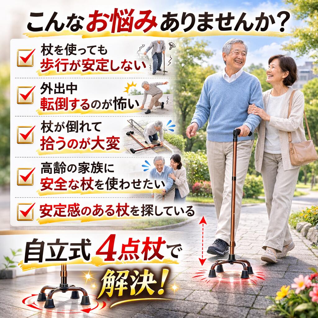 商品名 : 通常3000円➜楽天SALE中2800円 楽天1位 理学療法士監修 作業療法士監修 杖 自立式 四点杖 多点杖 オシャレ 軽量 女性 自立杖 ステッキ 母の日 おしゃれ お洒落 伸縮 シニア 散歩 自立 シニア ランキング 人気 つえ 先ゴム コンパクト 4点 4本足 軽量 伸縮 長さ調節可能