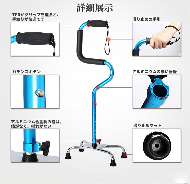 商品名 : 杖 伸縮 長さ調整 自立式 軽量 軽い 4点杖 四点杖 多点杖 杖 つえ ステッキ 介護 歩行補助 立位補助 立ち上がり リハビリ