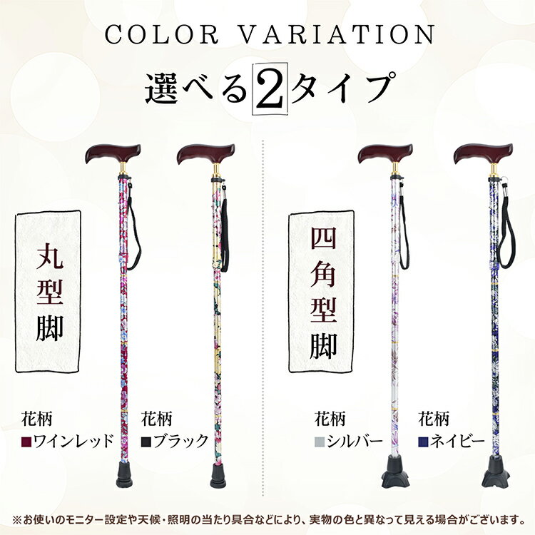 商品名 : 杖 折りたたみ 軽量 つえ 花柄 アルミ合金 木目調 グリップ ステッキ 伸縮 5段階調節 長さ調節 おしゃれ 歩行補助 コンパクト 散歩 収納袋付き 持ち運び 母の日 高齢 1点 四角型 丸型 足元 スリム 丈夫 軽い