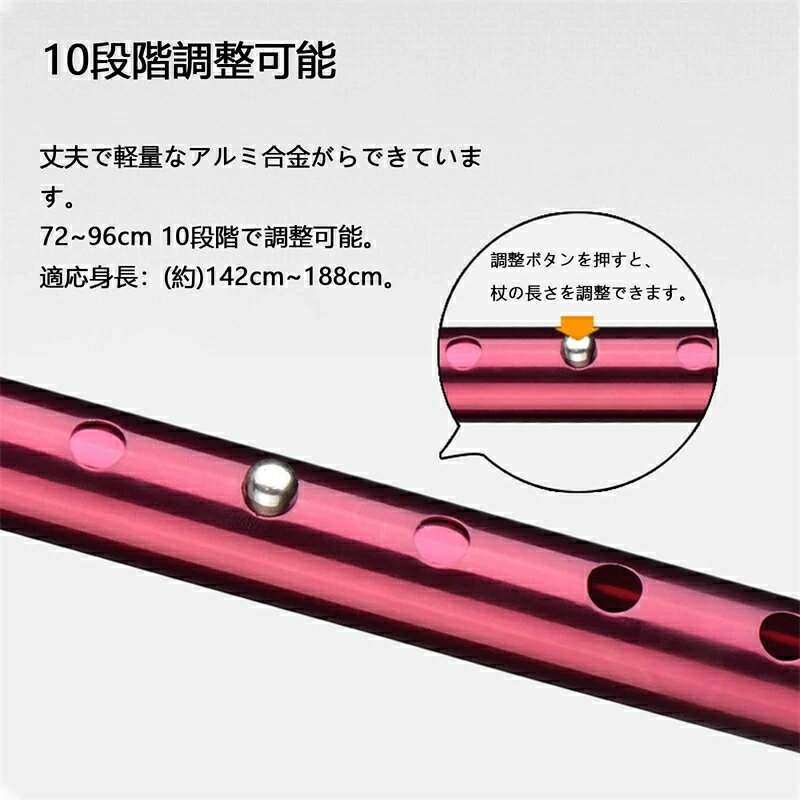 伸縮ステッキ 杖:杖は非常に快適な手触りで、手のひらの接触面が大きく、名札付きのストラップは杖の滑りを防止するだけでなく、名前と電話番号を杖にタグ付けすることもできます。 安全で信頼できます。 10段階の高さ調節:自立式杖は身長140cm〜190cmの方に適しています。 調整ボタンを押してポストをスライドさせて、身長に合わせてポールの長さを72〜96cmに調整します。杖の長さは2.5cmごとに調節することができ、身長に合わせて使用することができます。 四つ足の杖:四点滑り止めゴムベース、より安定性と耐久性。 滑り止めベースは、凹凸のある表面で優れた安定性と接地を提供します。 砂利道、石道、凸凹道での衝撃を軽減し、ボディの関節へのダメージを軽減します。 軽くて丈夫:当店の杖の重量は 460 グラムです。非常に強く耐久性があります。 膝や足に問題のある方、ご高齢の方、腰痛、捻挫の方、足への負担を軽減したい方に。 ▼ ※こちらの対応と商品について何かご不満がありましたら、「レビュー」を付ける前に一度ショップとご連絡してお願いいたします、ショップの誠意を持って最後まで対応させていただきます。 ※商品には多少の個体差がございます。予めご了承くださいませ。 ※発送途中で箱が潰れる可能性があります。ご理解お願いします。 ※PC環境・光の具合により、色や素材のイメージが写真と若干異なる場合がございます。 ※モデル・写真に使用されているアクセサリー・小物は別途記載が無い限り付属いたしません。 ※商品のお色はお客様のPC環境によって多少色合い、見え方など違ってまいりますのでご了承下さいますようお願いします。 ※写真の色調はご使用のモニターの機種や設定により実際の商品と異なる場合があります。 ※商品のサイズは、全て平置きにて外寸を測定しております。 ※商品によっては±1cm〜3cmの誤差が発生してしまう場合がございます。予めご理解いただきますようお願い致します。 ※該当商品は他店と在庫共有です。タイミングにより、在庫ズレが生じる場合がございます。予めご了承ください。 ※パッケージは改良のため予告なく仕様を変更する場合があります、ご理解いただきますようお願い致します。