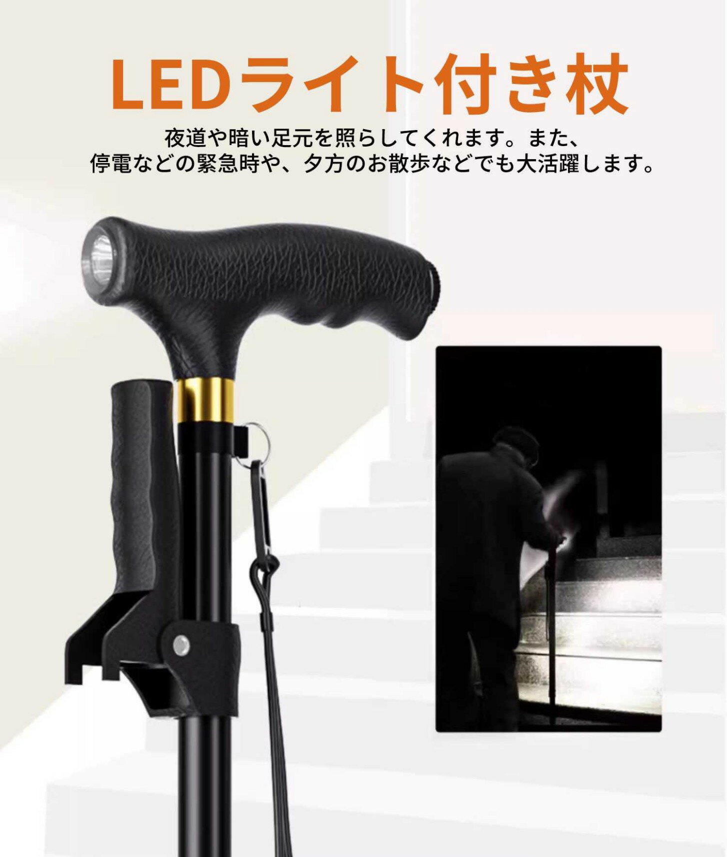 商品名 : \1本杖の3種類のウォーキングベース /ステッキ 杖 倒れない 1点杖&4点杖共有 360°回転 軽量 アルミ製 補助ハンドル付き 自立式4点杖 12段階長さ調整 クレバーケーン伸縮式 高齢者 介護/歩行支援 松葉杖 LEDライト付き 夜間散歩 母の日 父の日 敬老の日 プレゼント