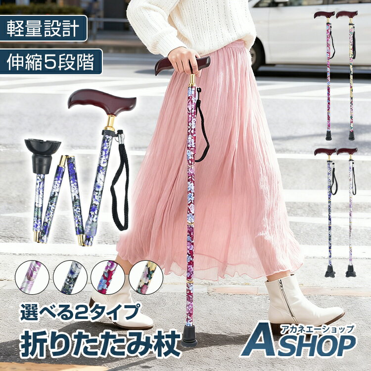 杖 折りたたみ 軽量 つえ 花柄 アルミ合金 木目調 グリップ ステッキ 伸縮 5段階調節 長さ調節 おしゃれ 歩行補助 コンパクト 散歩 収納袋付き 持ち運び 母の日 高齢 1点 四角型 丸型 足元 スリム 丈夫 軽い