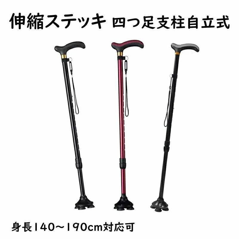伸縮ステッキ 自立式 四つ足の杖 軽量 つえ 杖 四つ足 男女が適用 アルミ 歩行補助杖 10段階調節 身長140〜190cmが似合います 敬老の日 プレゼント