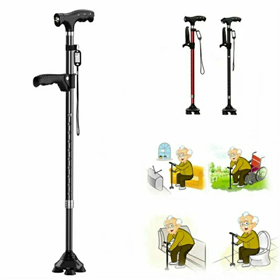 ステッキ 杖 倒れない 自立式4点杖 男女兼用 クレバーケーン伸縮式 軽量 アルミ製 補助ハンドル付き 高齢者 介護/歩行支援 松葉杖 LEDライト付き 夜間散歩 母の日 父の日 敬老の日 プレゼント