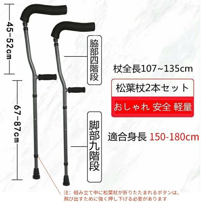 商品名 : 松葉杖 2本セット 自立杖 自立式ステッキ 折りたたみ つえ 歩行補助 介護用品 伸縮 長さ調整 軽量 コンパクト 軽い 女性 男性 子供 子ども 小学生 大人 お洒落 おしゃれ 骨折 怪我 杖 介護 ステッキ アルミ製 介護 歩行補助 リハビリ ゴム付き 敬老の日 プレゼント ギフト