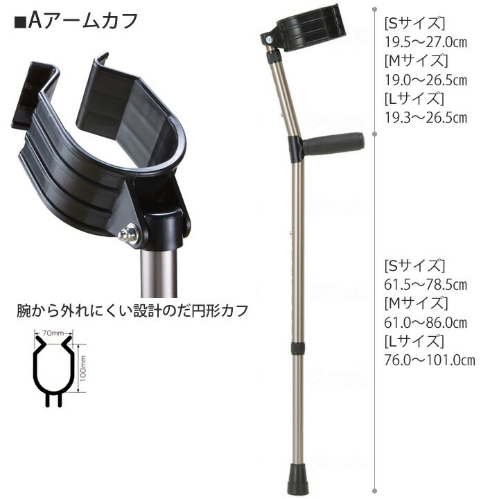 ※各色のLサイズは大変人気商品のため現在欠品中となっております。次回の入荷予定につきましては、未定となっております。ご迷惑をお掛け致しまして大変申し訳ございません。ご注文の際には予めご了承頂けますようお願い致します。 NEW! あると便利なコンパクト車いすの新商品○ABS樹脂製アームカフを採用。前腕部で支持することにより体重を支えます。グリップから手を離しても前腕は、腕から離れにくい設計になっています。○非課税<材質>○アルミ製○替えゴムはこちらS・Mサイズ用、Lサイズ用仕様表詳細[Sサイズ]全長:795〜1040mm重量:490g床〜グリップ:615〜785mmグリップ〜アームカフ:195〜270mm[Mサイズ]全長:795〜1150mm重量:550g床〜グリップ:610〜860mmグリップ〜アームカフ:190〜265mm[Lサイズ]全長:945〜1265mm重量:650g床〜グリップ:760〜1010mmグリップ〜アームカフ:193〜265mm規格1個