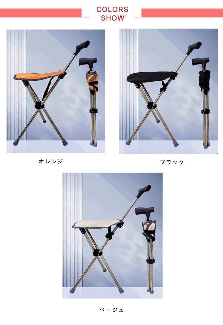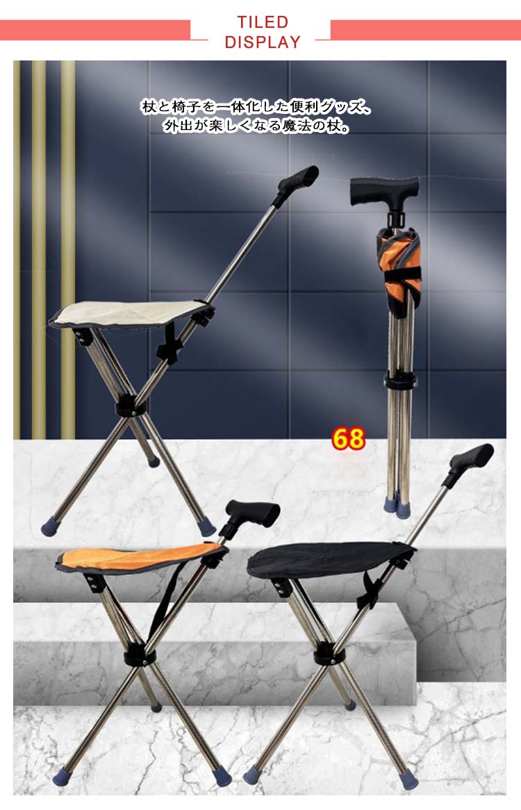 一瞬で椅子になる杖♪いつでもどこでも座れるステッキチェア 耐荷重200KG 杖と椅子を一体化した便利グッズ、外出が楽しくなる魔法の杖。 本体部分は耐久性に優れた軽量アルミ合金製で、座面部分は6本ベルトの補強設計で、柔らかい素材で座り心地よく、使いやすく安定感抜群のステッキチェア。 人間工学に基づいて設計されたグリップは手のひらの形状に合わせた形状でしっかり握れて安定のフィット感が抜群の椅子になるステッキ。 手元のレバーを引くだけで、68cmから90cmまで無段階に杖の長さを調節できるから、レディースもメンズも使いやすく、階段の登りおりや椅子に腰かけている際など生活空間のなかでも長さが簡単に調節でき、大変便利です。 滑り止めゴムは鉄製プレート内蔵で、ワンランク上の耐久性を実現し、より長くお使い頂けるのが嬉しいポイント。 サイズ F サイズについての説明 F 杖状態の長さ:68-90cm 椅子状態の高さ:52-73cm 座面高さ:44cm※サイズ表の実寸法は商品によって1-3cm程度の誤差がある場合がございます。 素材 本体:アルミ合金 座面:オックスフォード 色 ベージュ オレンジ ブラック 備考 ●サイズ詳細等の測り方はスタッフ間で統一、徹底はしておりますが、実寸は商品によって若干の誤差(1cm~3cm )がある場合がございますので、予めご了承ください。 ●製造ロットにより、細部形状の違いや、同色でも色味に多少の誤差が生じます。 ●パッケージは改良のため予告なく仕様を変更する場合があります。 ▼商品の色は、撮影時の光や、お客様のモニターの色具合などにより、実際の商品と異なる場合がございます。あらかじめ、ご了承ください。 ▼生地の特性上、やや匂いが強く感じられるものもございます。数日のご使用や陰干しなどで気になる匂いはほとんど感じられなくなります。 ▼同じ商品でも生産時期により形やサイズ、カラーに多少の誤差が生じる場合もございます。 ▼他店舗でも在庫を共有して販売をしている為、受注後欠品となる場合もございます。予め、ご了承お願い申し上げます。 ▼出荷前に全て検品を行っておりますが、万が一商品に不具合があった場合は、お問い合わせフォームまたはメールよりご連絡頂けます様お願い申し上げます。速やかに対応致しますのでご安心ください。