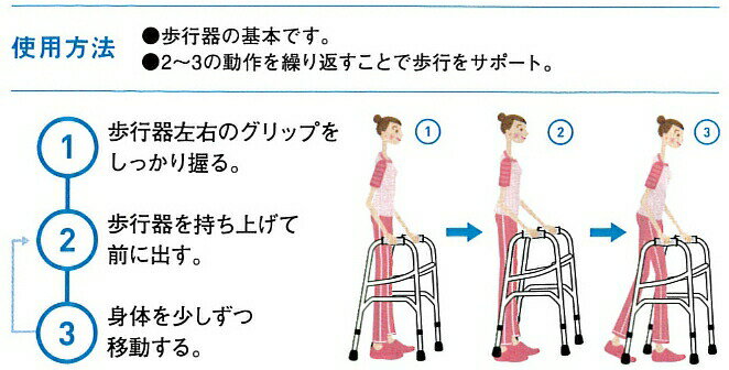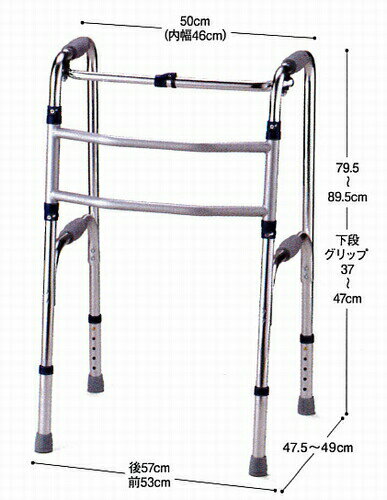 ※北海道・沖縄県・離島・一部地域は商品代金に関わらず追加送料がかかる場合があります。左右の握り手を交互に動かして移動する交互式 コンパクトサイズでご家庭や歩行訓練器として施設などにオススメ ・少しずつゆっくり歩行 ・室内・屋外両用タイプ ・交互型歩行器で歩行すると足はもちろん手のリハビリ ・グリップの高さ:2.5cmずつ5段階調節可能 ・折りたたみ式でコンパクト収納 ※収納時サイズ:W53×D12×H81.5cm ・一般的な日本人の体型に合わせグリップ内幅は45cmとコンパクト。ご自宅での使用にもおすすめ 【使用方法】 ・左右のフレームを交互に動かして移動する歩行補助器です。 ・歩行器左右のグリップをしっかり握ってご使用ください。 ・2〜5の動作を繰り返すことで歩行をサポートします。 1.歩行器のグリップをしっかり握る。 2.右アームの移動。 3.左足を前に出す。 4.左アームの移動。 5.右足を前に出す ※最大使用者体重:100kg ●サイズ/幅53×奥行47.5〜49×高さ79.5〜89.5cm、折りたたみ時:幅53×奥行12×高さ81.5cm、ハンドル内幅:46cm、下段グリップ高:37〜47cm ●重さ/3.2kg ●材質/本体:アルミ(一部スチール)、握り手:合成ゴム ●カラー/シルバー ●品番/KSAHR ●JANコード/4515914300918 ●メーカー/イーストアイ