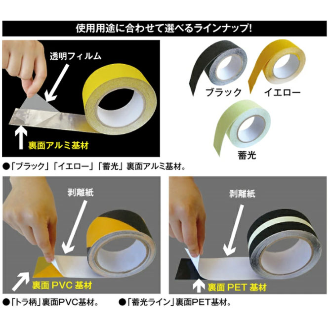 滑りやすい足元に強力すべり止め! 鉄製階段・通路などの滑りやすい場所に最適! 屋外で使用できる「すべり止めテープ ザラザラ」シリーズ! 表面は樹脂コーティングされているので、すべり止め部分の摩耗を防ぎ長期間使用できます。(使用環境による) 使用用途に合わせて選べるラインナップです! 【特長】 ●鉄製階段・通路などの滑りやすい場所に貼るだけですべり止め効果を発揮します。 ●屋内での急な停電時や、照明を落とした際に目立ちます。 ●表面を樹脂コーティングしているので粒子がとれづらいです。 [商品名]すべり止めテープ ザラザラ 蓄光 [カラー]蓄光 [サイズ]約巾50mm×5M巻 [材質]表面材質:鉱物粒子 基材:アルミ アクリル系粘着剤 [重量]約295g 【蓄光時間の目安】約2時間の照射で約2時間の識別可能! 【ご使用上の注意】 ●日光、蛍光灯などの紫外線を充分に照射させた状況下でないと、効果を発揮できません。 ●貼付ける面をきれいに清掃し、十分に乾燥させてください。 ●粘着面には、出来る限り触らないでください。 ●剥がす際は下地塗装が破損する恐れがありますので、丁寧に行ってください。 ●適当なサイズにカットする場合、ご使用になる刃物には十分注意して断裁してください。 ●施工時に表面の粒子で皮膚を傷つける場合があるので、手袋等を着用してください。 ●一度貼った本製品は剥がして再貼付けはできません。 ●粘着効果の低下や、すべり止め効果が低下した場合は、速やかに貼り替えを行ってください。 ●本製品は直射日光を避け、室温で保管してください。 ●本製品は、事故を予防したり被害を最小にするもので、使用される方の注意と配慮に代わるものではありません。 ■商品の色は徐々にですが、直射日光により退色する場合があります。 ■素材の性質により、万引きゲートに反応する場合があります。