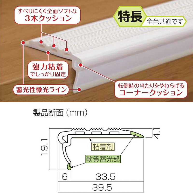 木製室内階段用スベリ止め材『スベラーズ』 すべりにくい3本クッションでしっかり守る家族の安心と階段の安全対策に スベリ止め材としての効果はもちろんのこと、万が一転倒してもコーナークッションが衝撃を吸収し、当りをやわらげる 【注意】 本製品は住宅室内木製階段のみにご使用ください。 カーペット等を貼った階段や、貼付け部に凹凸がある階段、ワックス等油分があり粘着が効きにくい階段では使用しないでください。 【古いものをはがす場合】 ヘアドライヤー等で十分に温めてください。粘着が柔らかくなり、はがしやすくなります。 ヘラやマイナスドライバー等で、片方から少しずつていねいにはがしてください。 ※はがす時に、階段踏板をキズ付けないように注意してください。 色:うす茶 長さ(mm):670 【材質】 スベリ止め材:塩化ビニール 粘着材:アクリル系粘着剤 商品写真は、 お使いのモニター設定、お部屋の照明等により実際の商品と色味が異なる場合がございます。