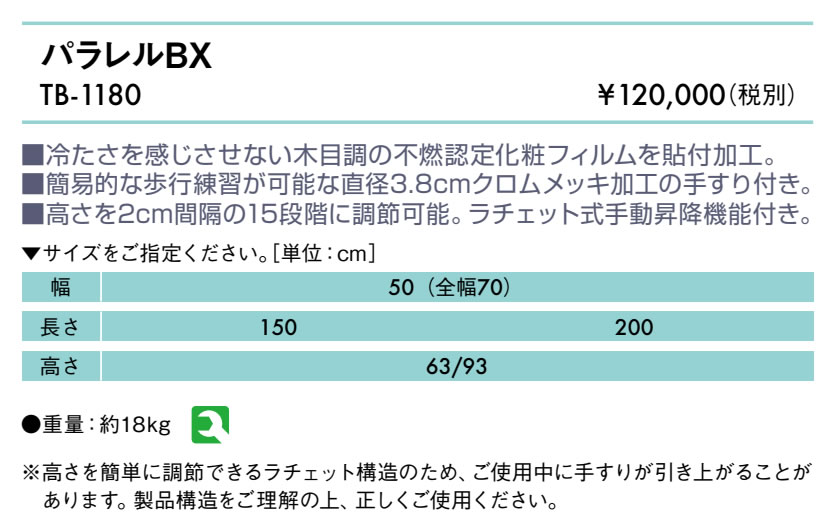 製品の仕様 重量 約18kg 幅 50cm(全幅70) 長さ 150 - 200cm 高さ 63〜93cm 組立の有無 組立必要(スパナ付属) 配送について 大型商品(大型宅配便)について お届けは玄関の前まで、ビルやマンションの場合は共同玄関口までの配達となります。配達員は1名でお伺いをいたしますので、トラックからの荷下ろし、 搬入が困難な場合、お客様にお手伝いをお願いしております。 再配達について 路線便での配送となるため、不在時の持ち帰りや再配達の際に別途費用が発生します。ご不明な点はお問い合わせください。 搬入・設置組立について 時間指定や階段を利用しての搬入、設置組立をご希望の場合も別途費用が発生します。必要な場合は予めご相談ください。 個人宅への配送について ご注文時の備考欄に(施設名・屋号・予定名称)をご記入ください。お届け先が個人様宛の場合、別途送料が必要です。 北海道・沖縄・離島へのお届けについて 追加送料が発生します。法人様につきましても追加送料分のご負担が必要です。 サポート情報 ※メーカー希望小売価格はメーカーカタログに基づいて掲載しています。TB-1180 パラレルBX 冷たさを感じさせない木目調の不燃認定化粧フィルムを貼付加工。簡易的な歩行練習が可能な直径3.8cmクロムメッキ加工の手すり付き。高さを2cm間隔の15段階に調節可能。ラチェット式手動昇降機能付き。※高さを簡単に調節できるラチェット構造のため、ご使用中に手すりが引き上がることがあります。製品構造をご理解の上、正しくご使用ください。 フレーム塗装に粉体塗装を採用!木材は全てF☆☆☆☆で安全安心です。 高田ベッド製作所正規特約店のエンバシーで安心をプラス! 関連商品はこちら(孔加工の有無やサイズ違い、オプションなど) パラレルWX ご注文はこちらから