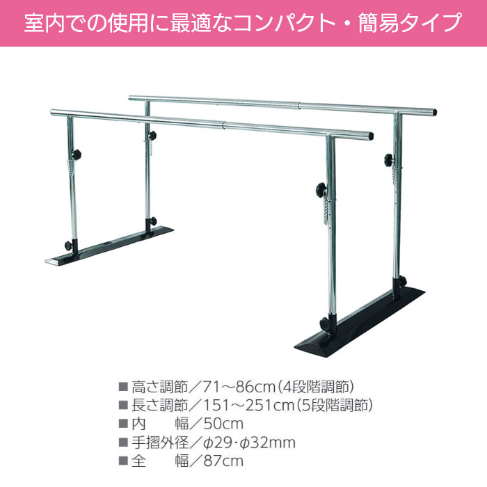 メーカー直送品の為、ご注文後の在庫確認となります。 ご自宅でのリハビリ訓練に最適なコンパクト・簡易タイプ。 高さ、長さを調節できます。 サイズ:高さ87.5cm×幅87cm×奥行25.5cm 高さ調節:71~86cm(4段階) 長さ調節:151~251cm(5段階) 内幅:50cm 全幅:87cm 手すり外径:Φ29・Φ32mm 重量:20.8kg 材質:スチール製メッキ仕上げ メーカー:カワムラサイクル