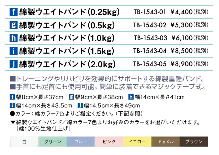 製品の仕様 サイズ 幅14cm×長さ41cm 配送について 大型商品(大型宅配便)について お届けは玄関の前まで、ビルやマンションの場合は共同玄関口までの配達となります。配達員は1名でお伺いをいたしますので、トラックからの荷下ろし、 搬入が困難な場合、お客様にお手伝いをお願いしております。 再配達について 路線便での配送となるため、不在時の持ち帰りや再配達の際に別途費用が発生します。ご不明な点はお問い合わせください。 搬入・設置組立について 時間指定や階段を利用しての搬入、設置組立をご希望の場合も別途費用が発生します。必要な場合は予めご相談ください。 個人宅への配送について ご注文時の備考欄に(施設名・屋号・予定名称)をご記入ください。お届け先が個人様宛の場合、別途送料が必要です。 北海道・沖縄・離島へのお届けについて 追加送料が発生します。法人様につきましても追加送料分のご負担が必要です。 サポート情報 ※メーカー希望小売価格はメーカーカタログに基づいて掲載しています。TB-1543-03 綿製ウエイトバンド(1.0kg) トレーニングやリハビリを効果的にサポートする綿製重錘バンド。手首にも足首にも使用可能。簡単に装着できるマジックテープ式。 綿カラーは7色からお選びいただけます。 高田ベッド製作所正規特約店のエンバシーで安心をプラス! 関連商品はこちら(孔加工の有無やサイズ違い、オプションなど) 綿製ウエイトバンド(0.25kg) 綿製ウエイトバンド(0.5kg) 綿製ウエイトバンド(1.5kg) 綿製ウエイトバンド(2.0kg) ご注文はこちらから