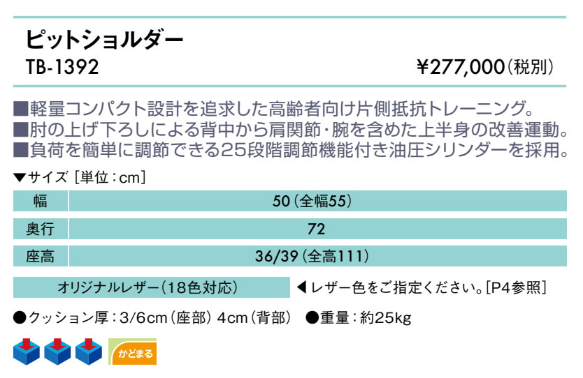 製品の仕様 クッション厚 3/6cm(座部) 4cm(背部) 重量 約25kg 幅 50cm(全幅55) 奥行 72cm 座高 36/39cm(全高111) 組立の有無 組立済み 強度レベル(メーカー指標 5段階) 1つのアイコンに対し製品強度(等分布荷重)は100kgです。 配送について 大型商品(大型宅配便)について お届けは玄関の前まで、ビルやマンションの場合は共同玄関口までの配達となります。配達員は1名でお伺いをいたしますので、トラックからの荷下ろし、 搬入が困難な場合、お客様にお手伝いをお願いしております。 再配達について 路線便での配送となるため、不在時の持ち帰りや再配達の際に別途費用が発生します。ご不明な点はお問い合わせください。 搬入・設置組立について 時間指定や階段を利用しての搬入、設置組立をご希望の場合も別途費用が発生します。必要な場合は予めご相談ください。 個人宅への配送について ご注文時の備考欄に(施設名・屋号・予定名称)をご記入ください。お届け先が個人様宛の場合、別途送料が必要です。 北海道・沖縄・離島へのお届けについて 追加送料が発生します。法人様につきましても追加送料分のご負担が必要です。 サポート情報 ※メーカー希望小売価格はメーカーカタログに基づいて掲載しています。TB-1392 ピットショルダー 軽量コンパクト設計を追求した高齢者向け片側抵抗トレーニング。肘の上げ下ろしによる背中から肩関節・腕を含めた上半身の改善運動。負荷を簡単に調節できる25段階調節機能付き油圧シリンダーを採用。 製品の特徴 レザーカラーは18色のオリジナルレザーからお選びいただけます。 メディカル専用に開発された5つの特性を持つ高耐久ビニルレザーです。 フレーム塗装に粉体塗装を採用!木材は全てF☆☆☆☆で安全安心です。 高田ベッド製作所正規特約店のエンバシーで安心をプラス! ご注文はこちらから